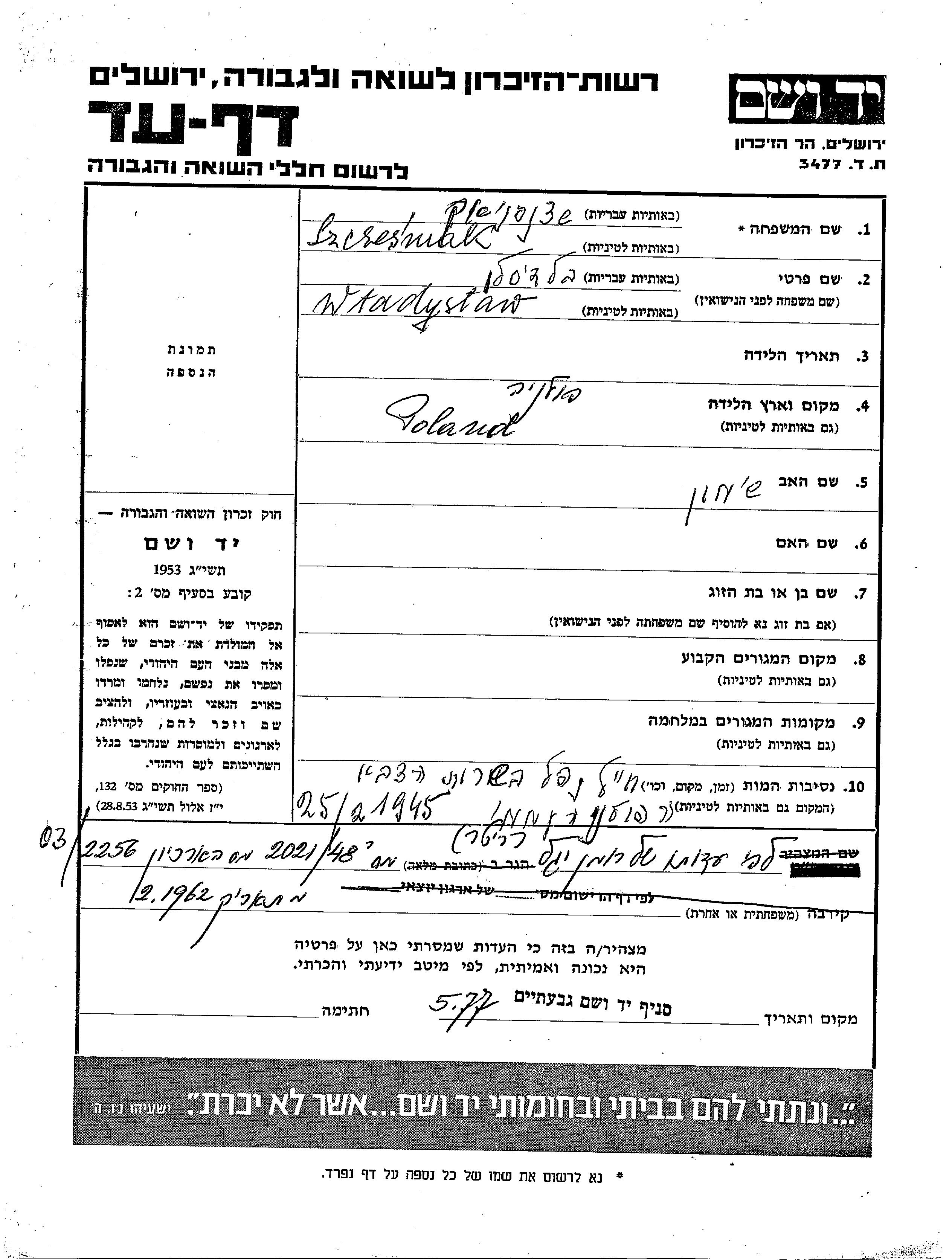 Wladyslaw was murdered in the Shoah. Place of death: unknown, 25/02/1945.