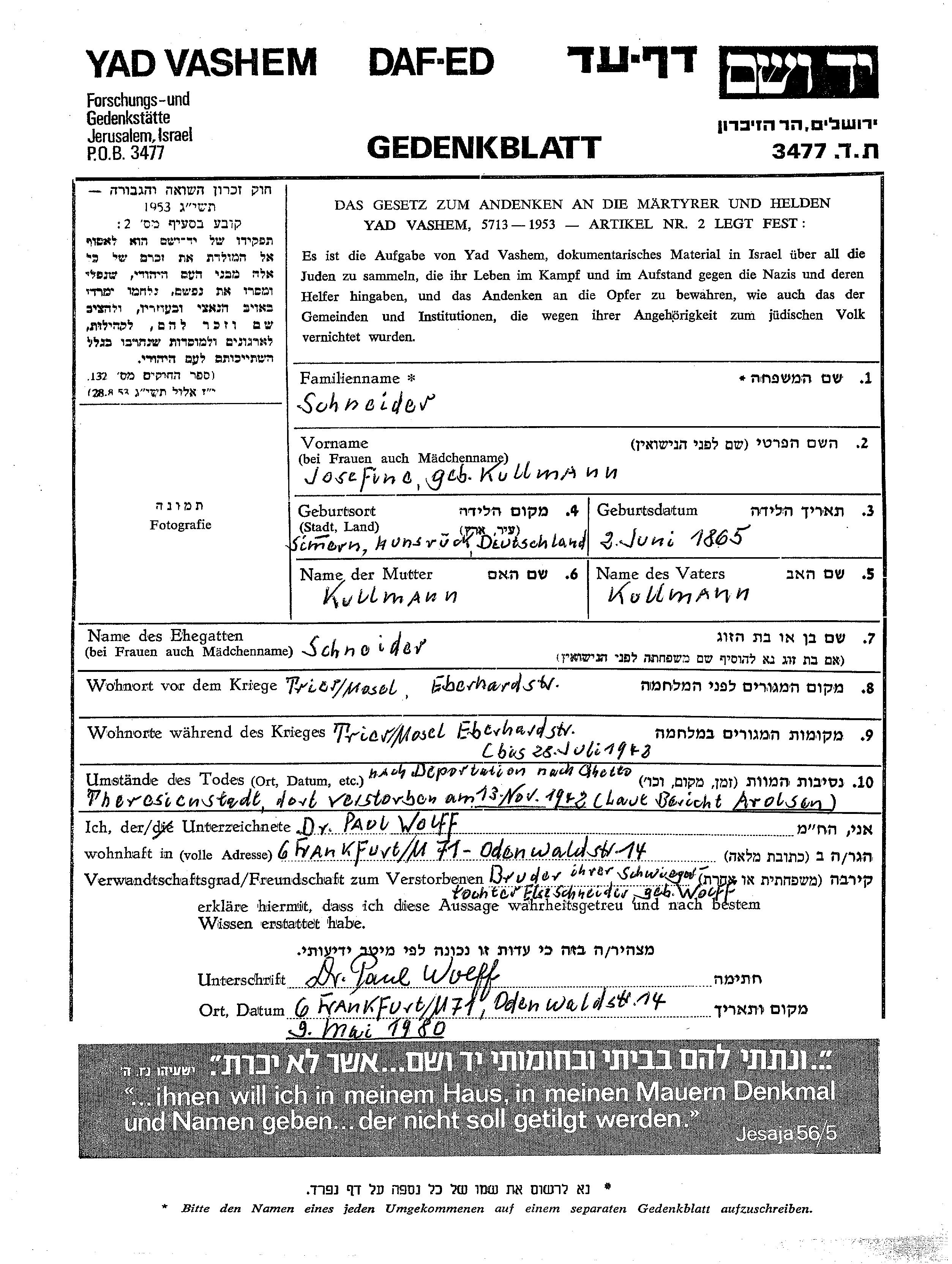 Schneider Josefine 1865 Trier, Germany Page of Testimony
