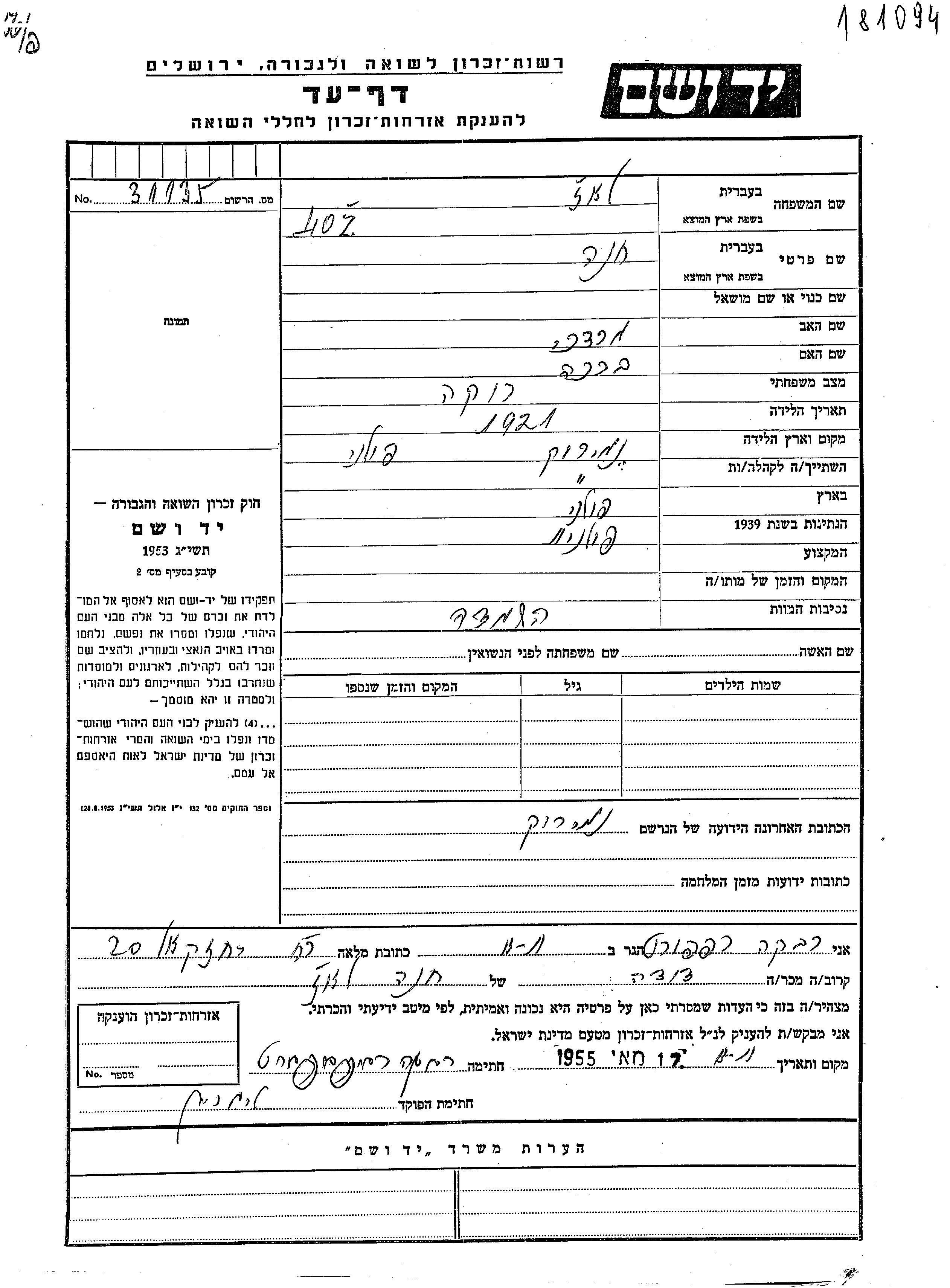 Khana Loz was born in Niemirow, Poland, 1921 to Mordekhai and Brakha. She was single. Prior to WWII she lived in Niemirow, Poland.