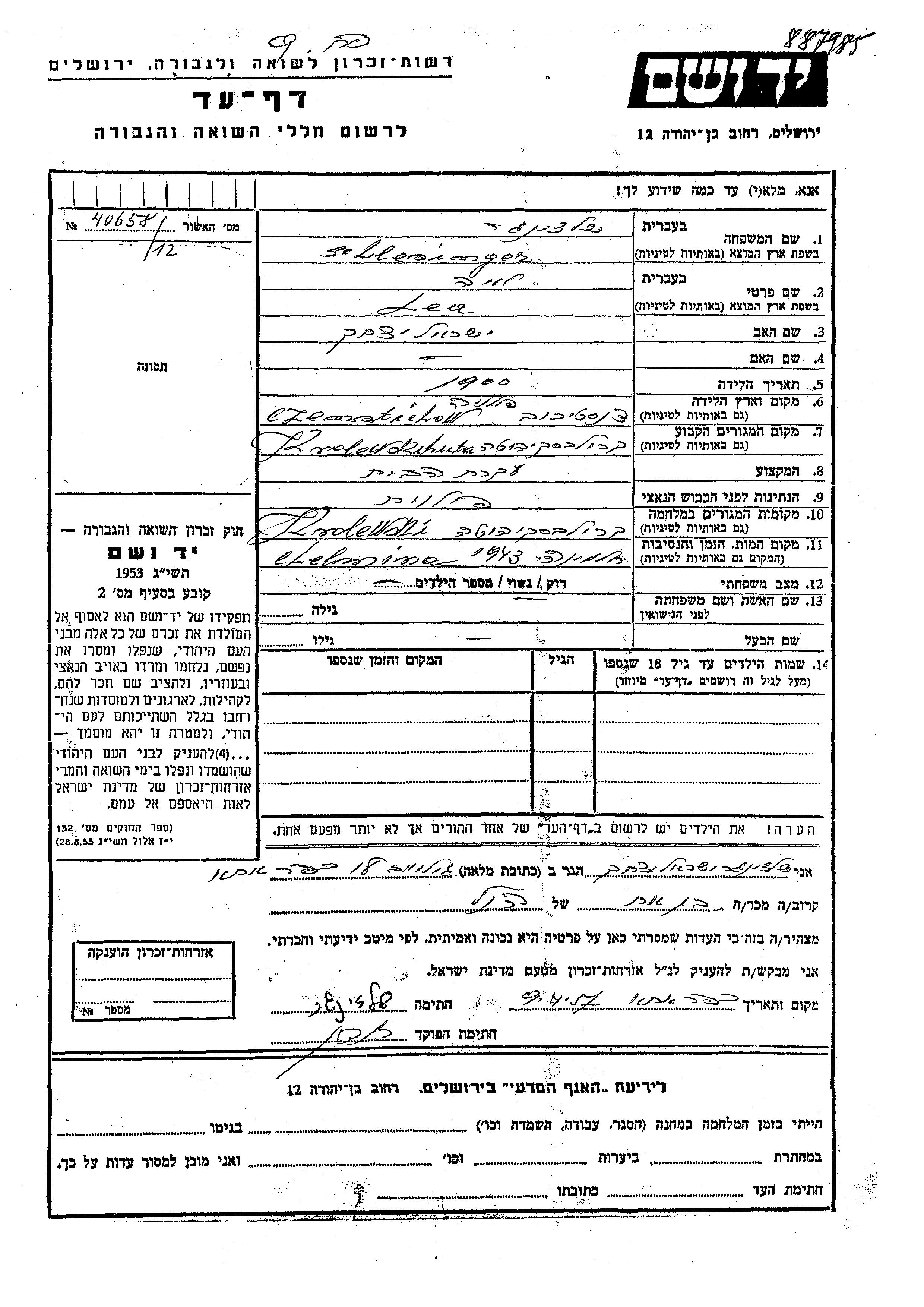Lea Shlezinger was born in Czestochow, Poland, 1900 to Yisrael Yitzkhak. She was a housewife and married. Prior to WWII she lived in Krolewska Huta, Poland. During the war she was in Krolewska Huta, Poland.