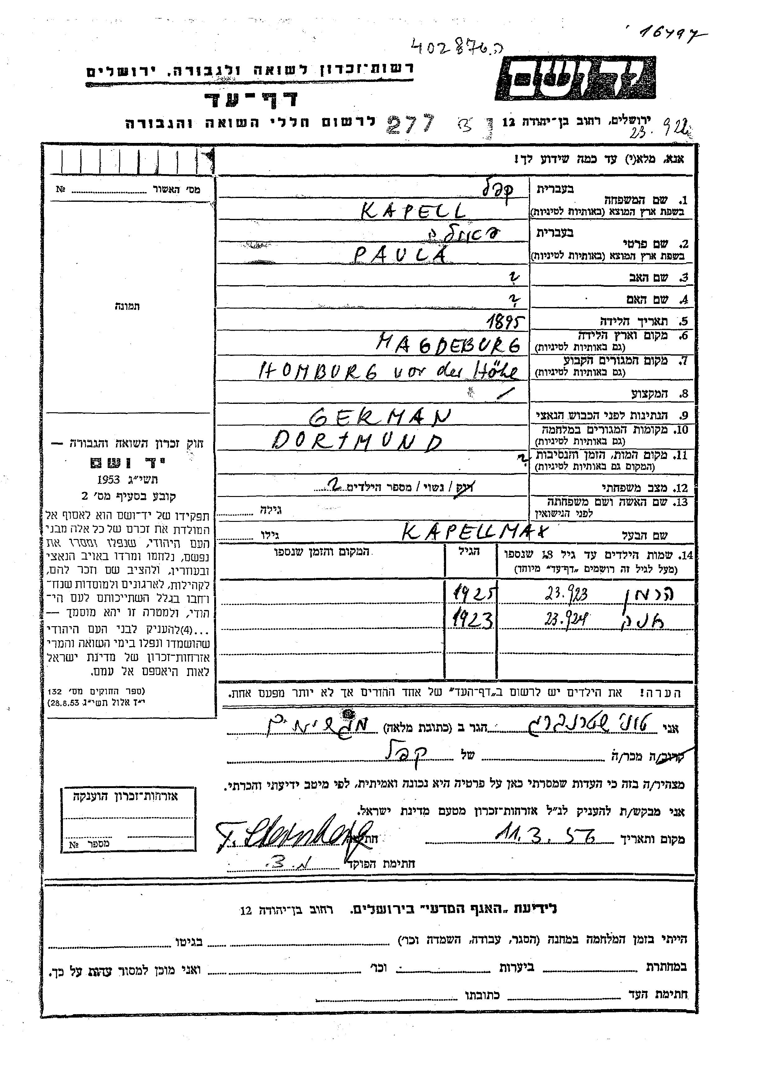 Kapell Paula 1895 Hamburg, Germany Page of Testimony