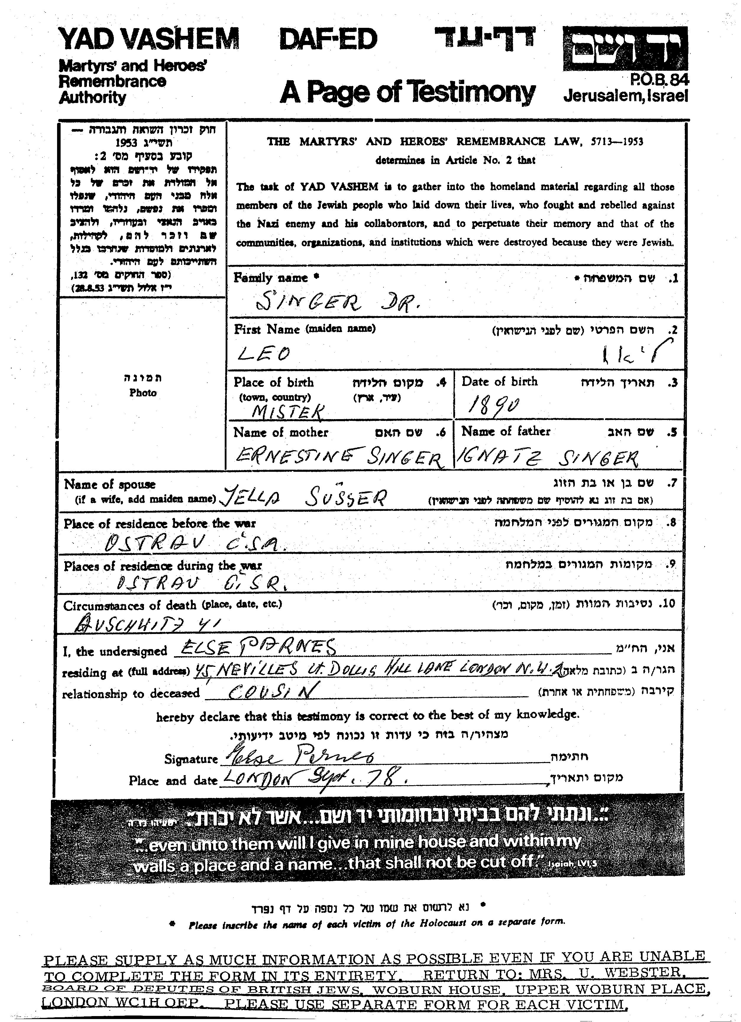 Dr. Leo Singer was born in Mistek, Czechoslovakia, 1890 to Ignatz and Ernestine. He was married to Jella nee Susser. Prior to WWII he lived in Ostrau, Czechoslovakia. During the war he was in Ostrau, Czechoslovakia. Dr. Singer was murdered in the Shoah. Place of death: Auschwitz, Poland, 1941.
