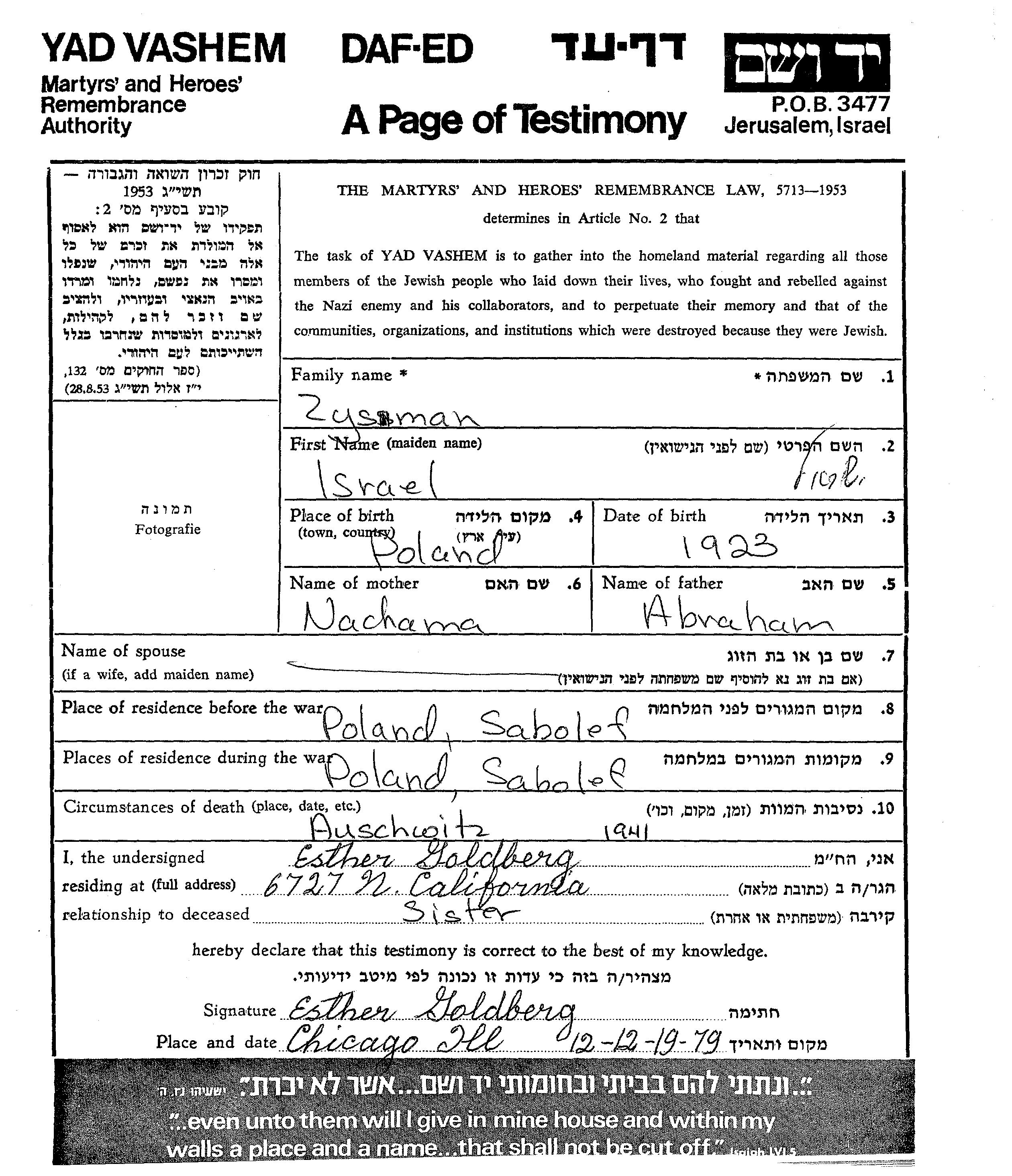 Israel Zysman was born in Poland, 1923 to Abraham and Nachama. Prior to WWII he lived in Sobolew, Poland. During the war he was in Sobolew, Poland. Israel was murdered in the Shoah. Place of death: Auschwitz, Poland, 1941.