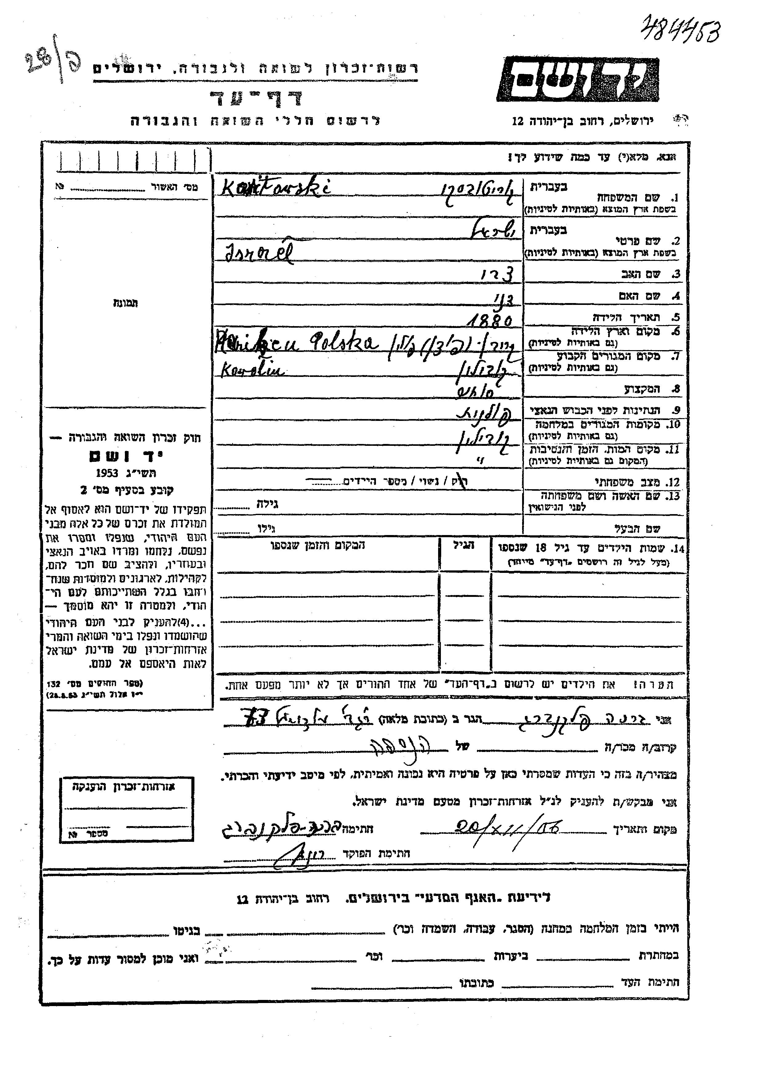 Israel Koritovski was born in Kobylin, Poland, 1880 to Tzvi and Dani. He was a merchant and married. Prior to WWII he lived in Kobylin, Poland. During the war he was in Kobylin, Poland. Israel was murdered in the Shoah. Place of death: Kobylin, Poland.