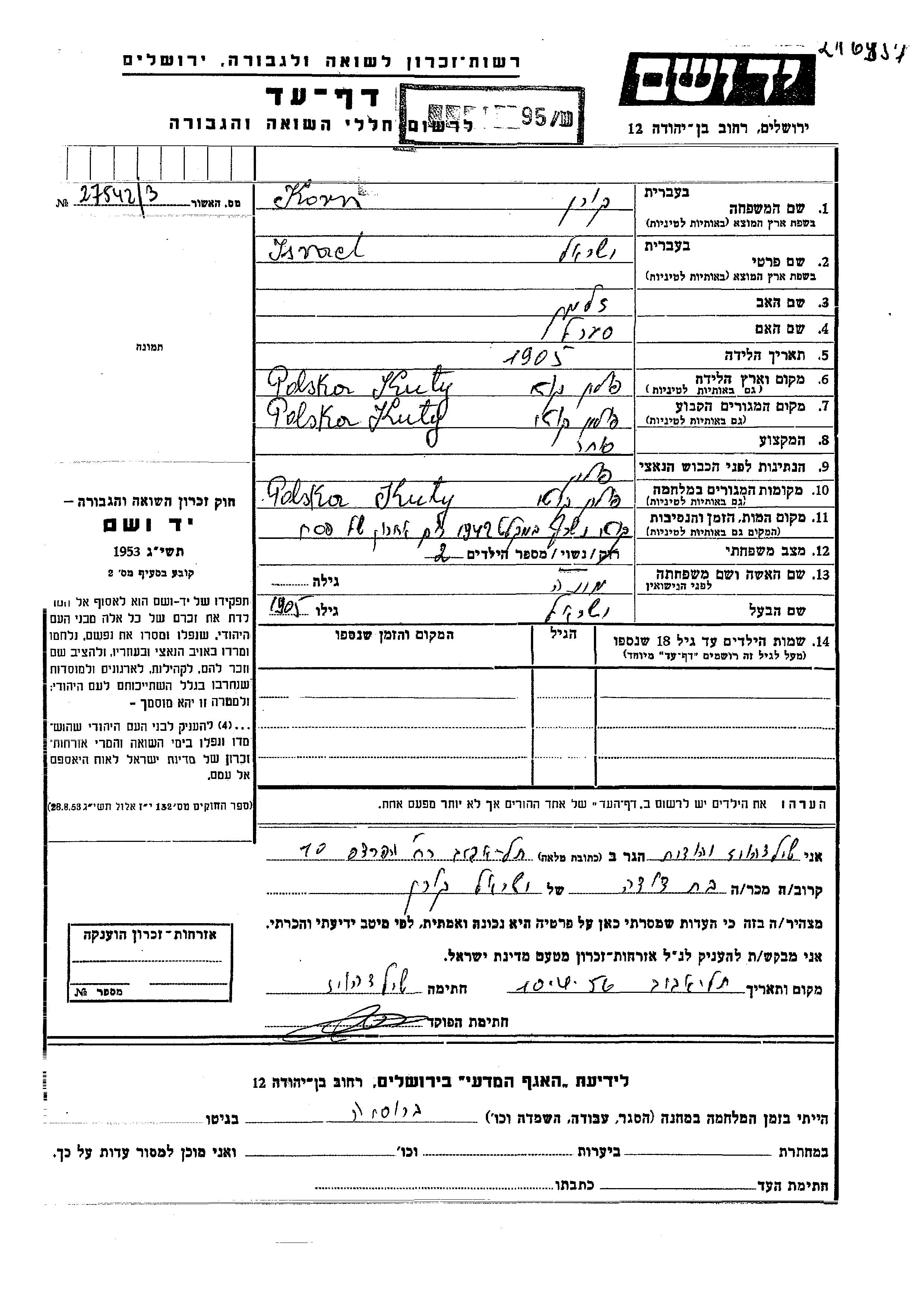 Korn Israel 1905 Kuty, Poland Page of Testimony