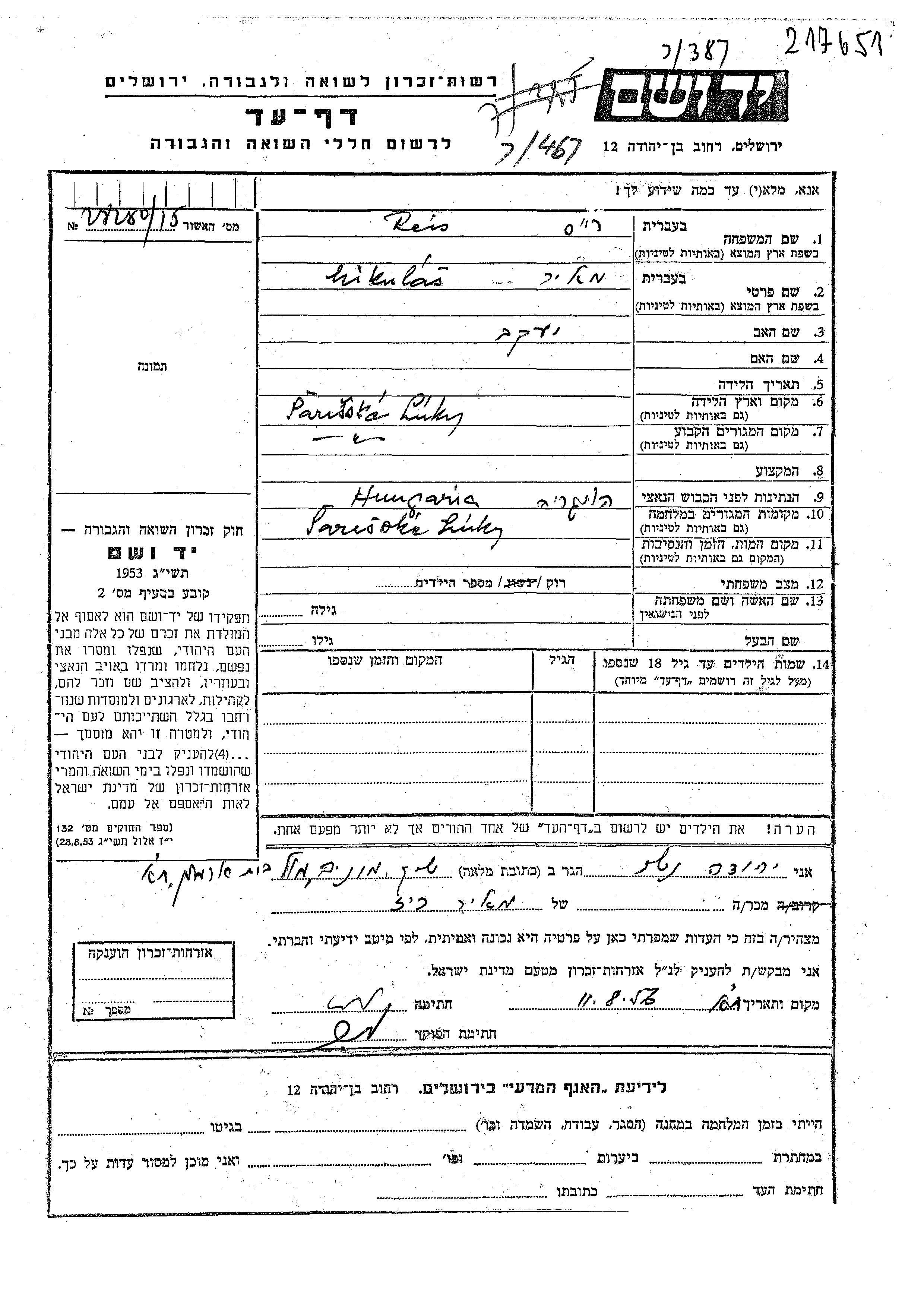 Mikulas Meir Reis was born in Sarisske Luky, Czechoslovakia to Yaakov. He was single. Prior to WWII he lived in Sarisske Luky, Czechoslovakia. During the war he was in Sarisske Luky, Czechoslovakia. Mikulas Meir was murdered in the Shoah.