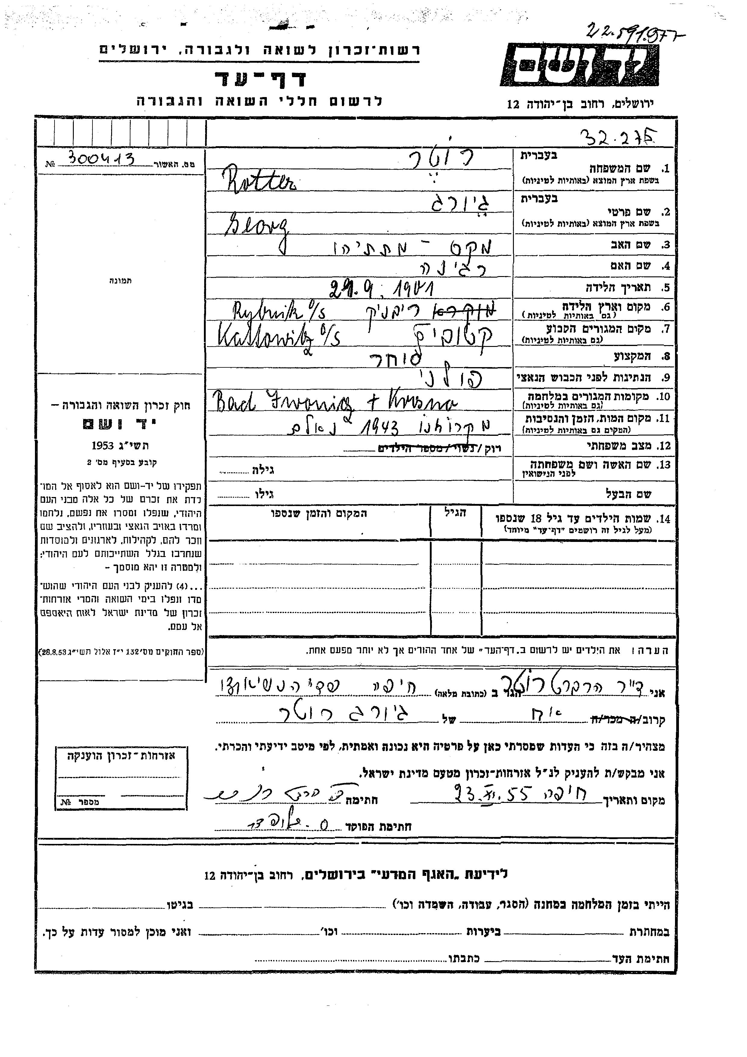 Giorg Rotter was born in Rybnik, Poland, 1901 to Max Matatiahu and Regina. He was a merchant and single. Prior to WWII he lived in Kattowitz, Poland. During the war he was in Krosno, Poland. Giorg was murdered in the Shoah. Place of death: unknown, 1943.
