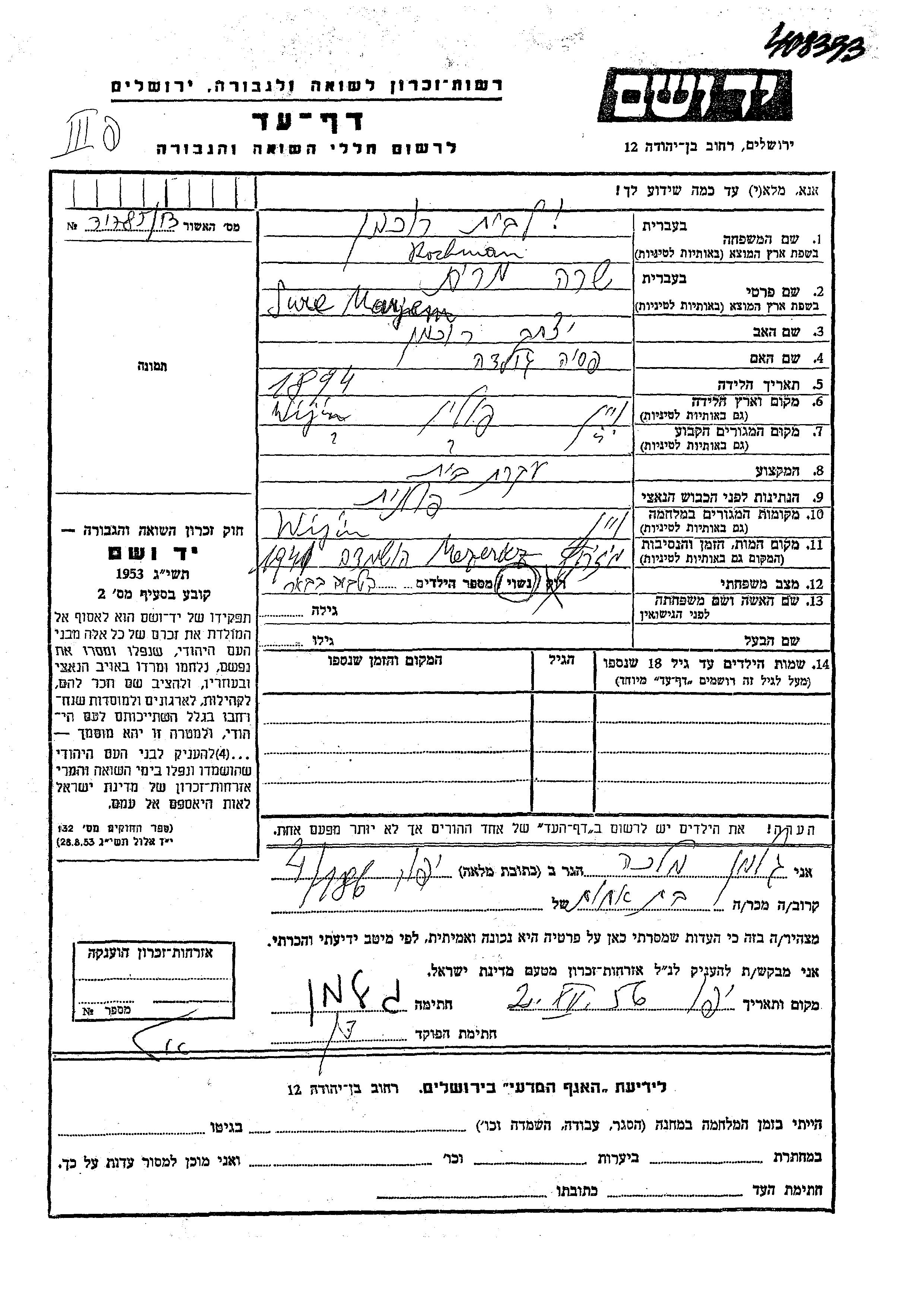 Yad Vashem - Pages of Testimony Names Memorial Collection