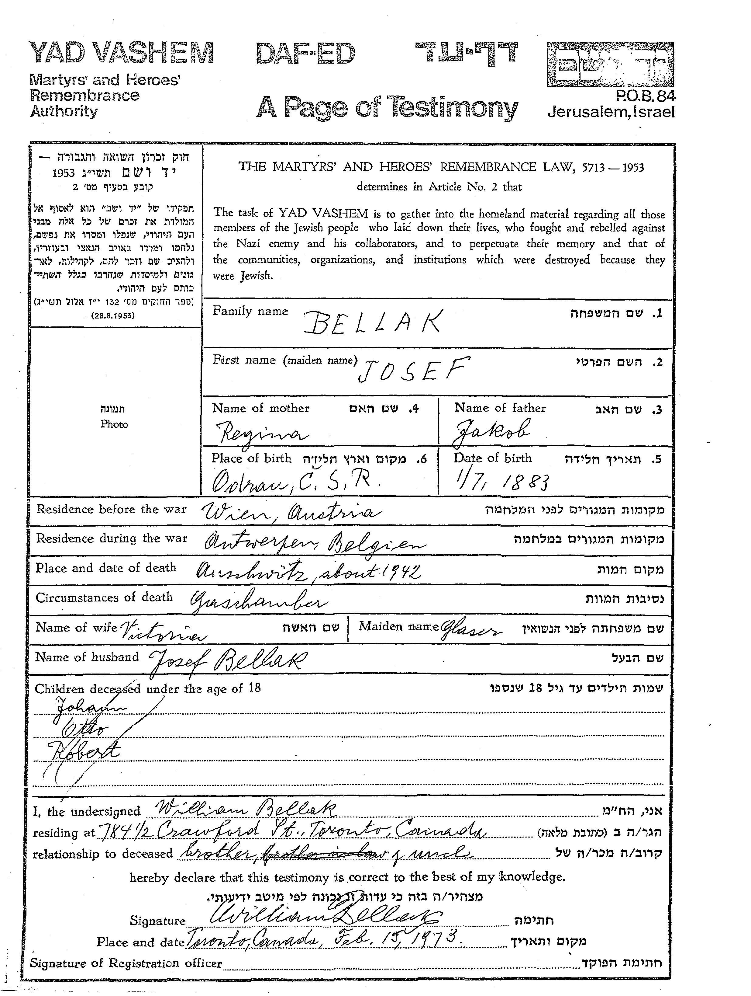 Bellak Josef 1883 Wien, Austria Page of Testimony