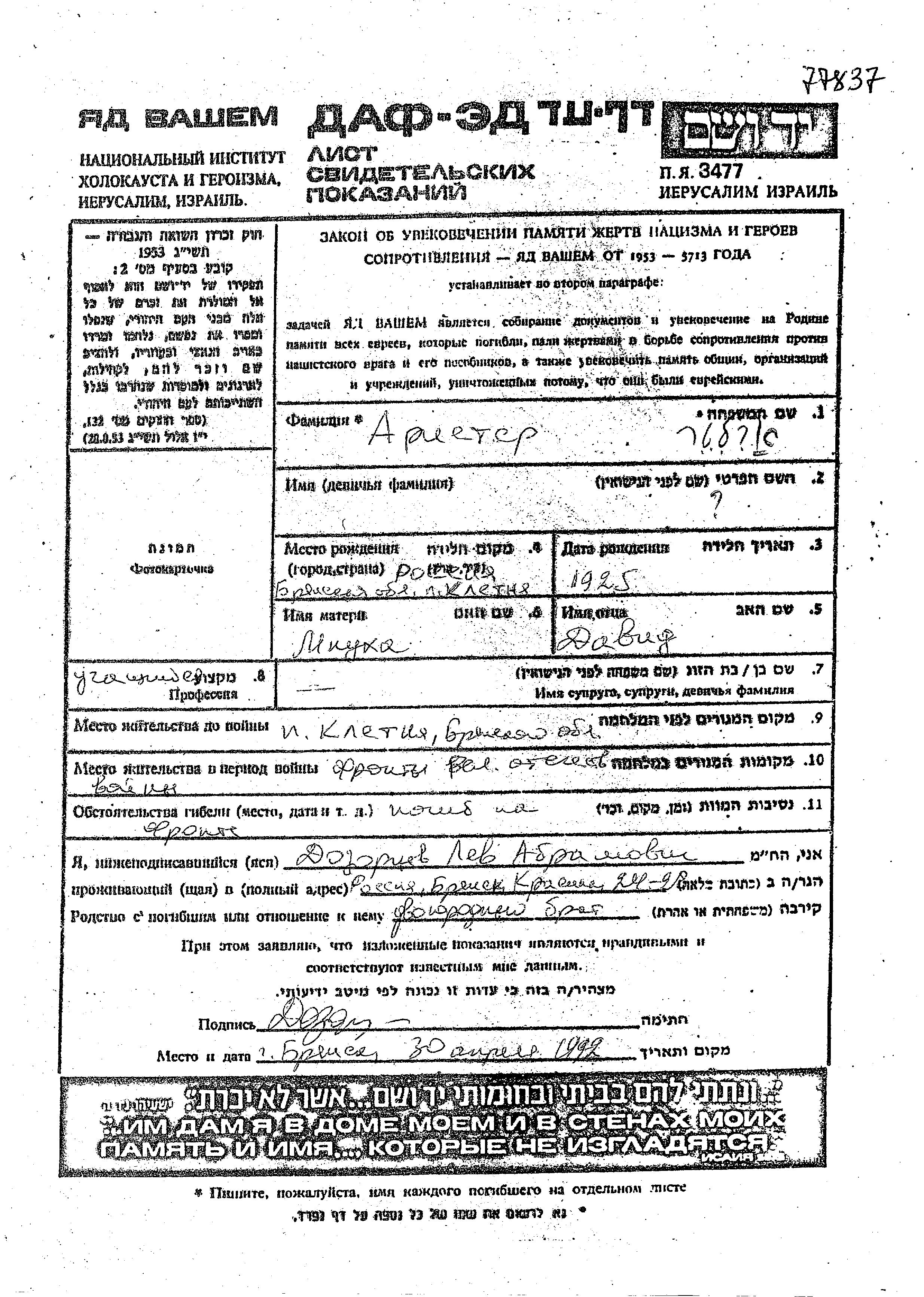 First name unknown Ariyeter was born in Kletnya, Russia (USSR), 1925 to David and Mnukha. He was a pupil. Prior to WWII he lived in Kletnya, Russia (USSR). During the war he was in the Soviet armed forces. He was killed in military service in WWII.