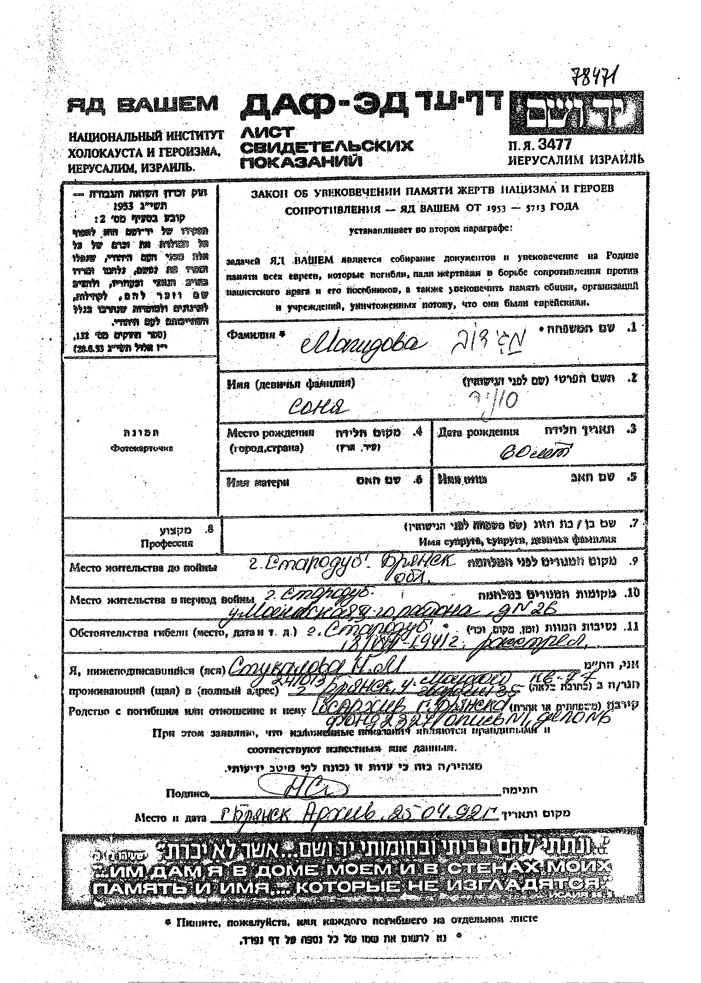 Sonia Magidov was born, 1881. Prior to WWII she lived in Starodub, Russia (USSR). During the war she was in Starodub, Russia (USSR). Sonia was murdered in the Shoah. Place of death: Starodub, Russia (USSR), 18/08/1941.