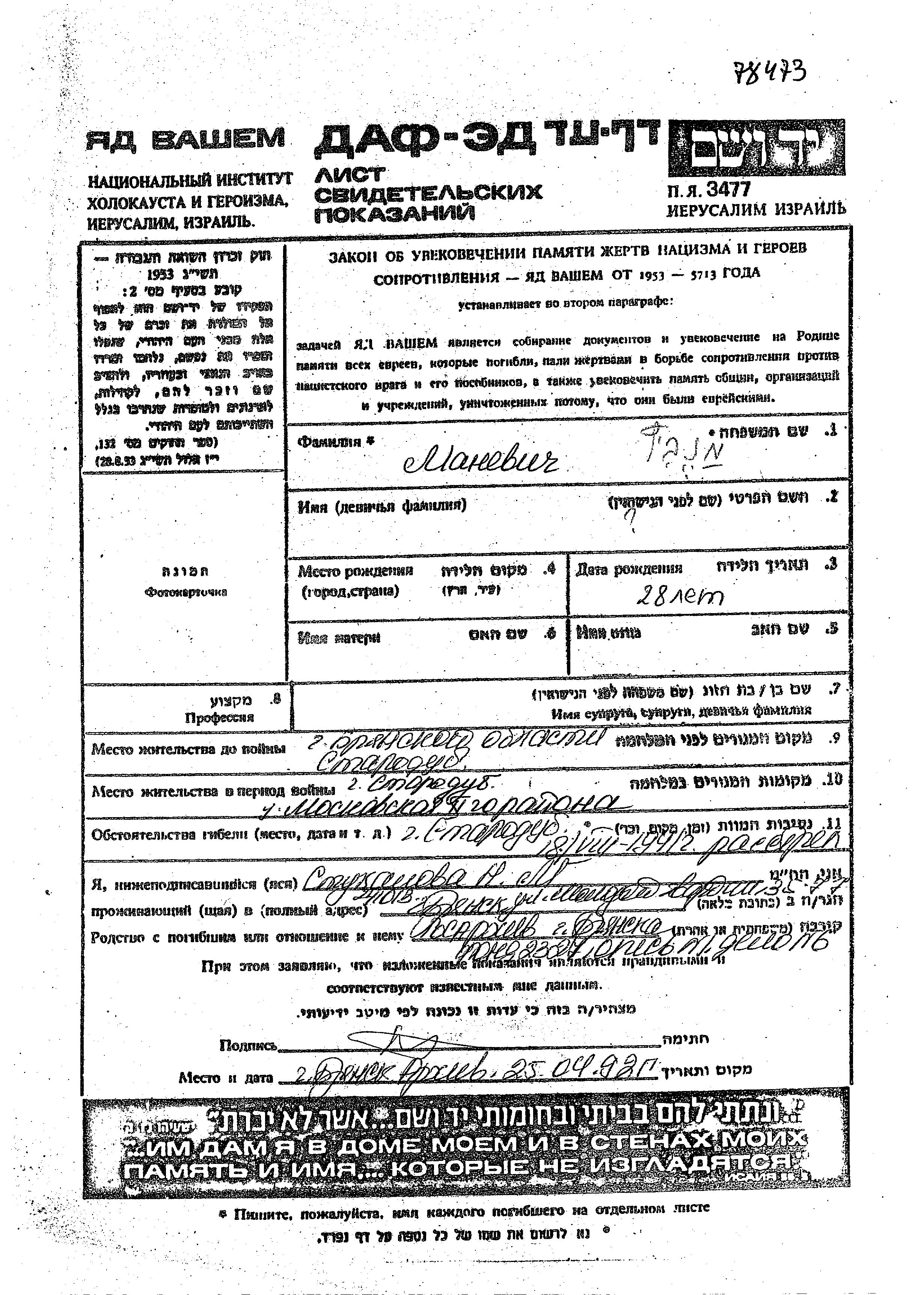 First name unknown Manevich was born, 1913. Prior to WWII lived in Starodub, Russia (USSR). During the war was in Starodub, Russia (USSR).