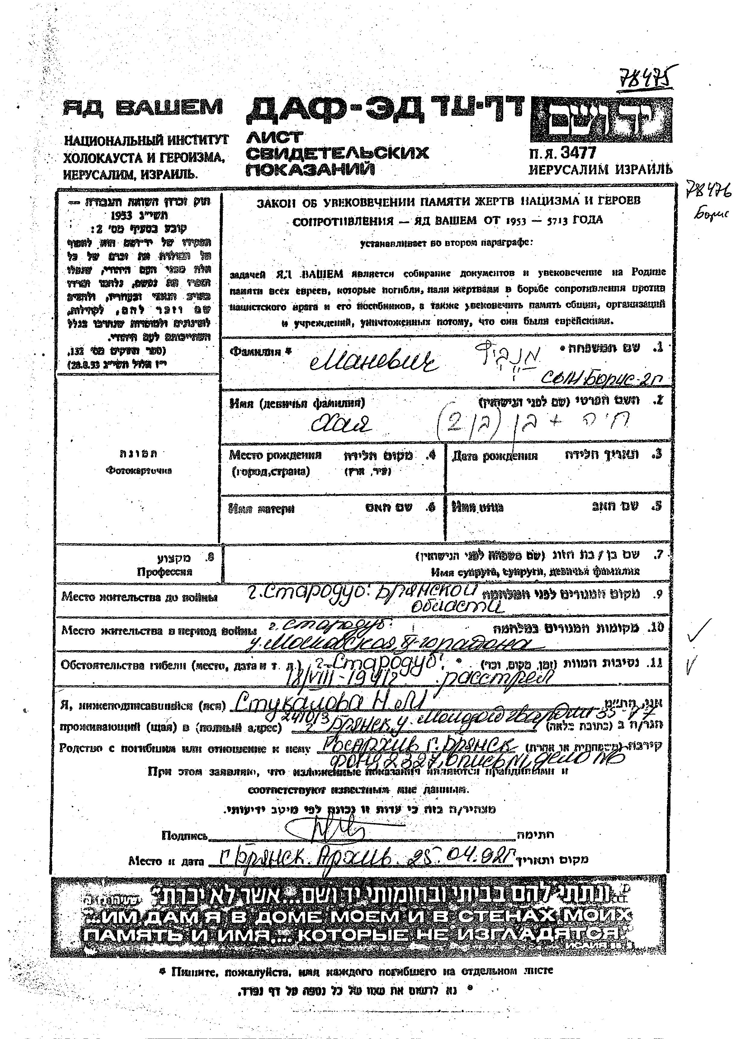 Khaia Manevich. Prior to WWII she lived in Starodub, Russia (USSR). During the war she was in Starodub, Russia (USSR). Khaia was murdered in the Shoah. Place of death: Starodub, Russia (USSR), 18/08/1941.