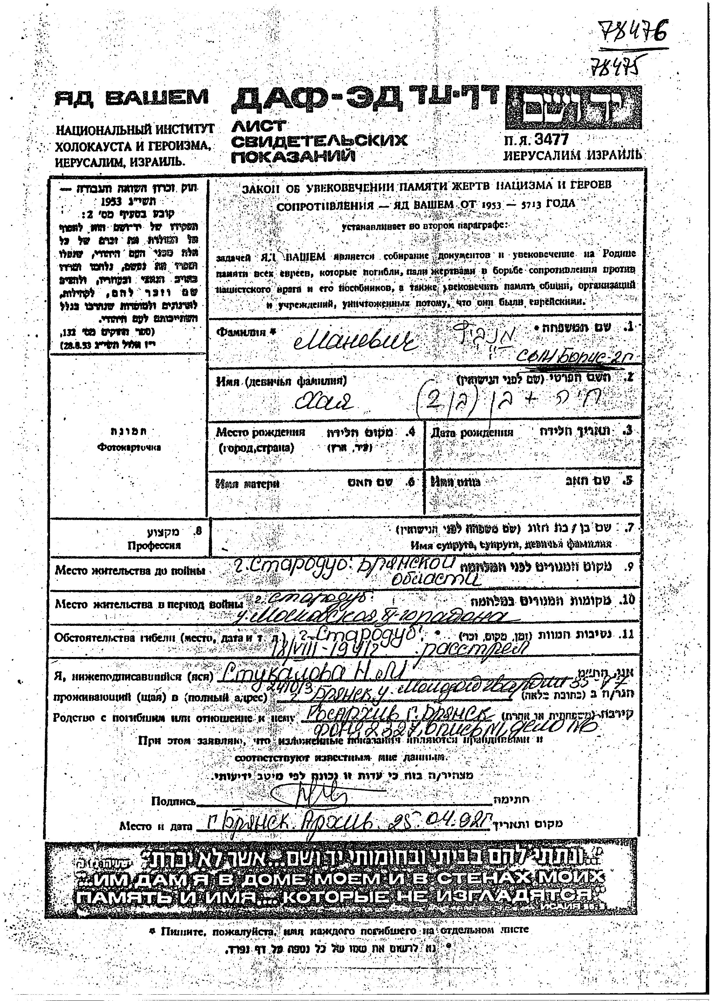 Boris Manevich was born, 1939 to Khaia. He was child. Prior to WWII he lived in Starodub, Russia (USSR). During the war he was in Starodub, Russia (USSR). Boris was murdered in the Shoah. Place of death: Starodub, Russia (USSR), 18/08/1941.