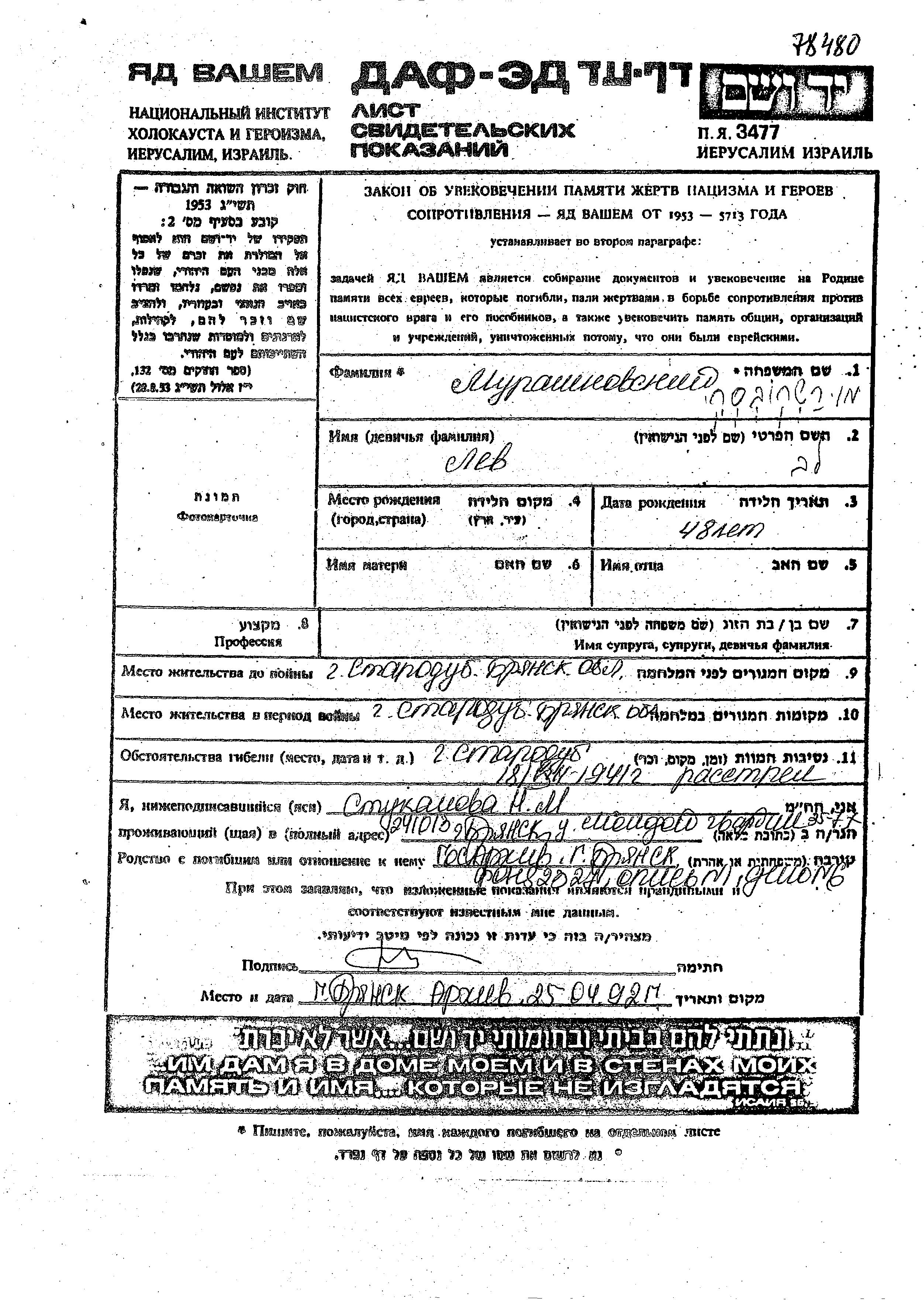 Lev Murashkovski was born, 1893. Prior to WWII he lived in Starodub, Russia (USSR). During the war he was in Starodub, Russia (USSR). Lev was murdered in the Shoah. Place of death: Starodub, Russia (USSR), 18/08/1941.