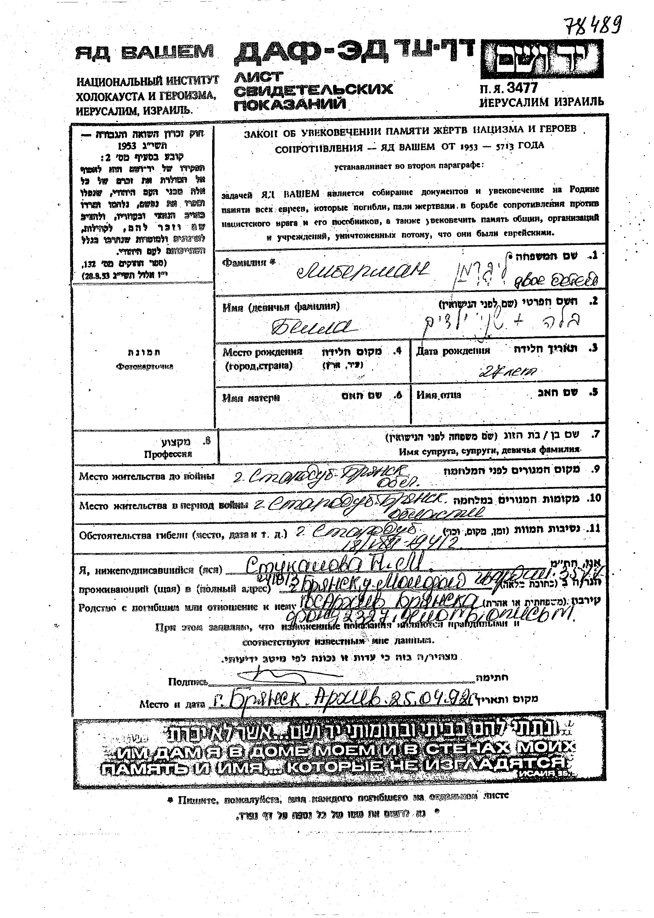 Bela Liberman was born, 1914. Prior to WWII she lived in Starodub, Russia (USSR). During the war she was in Starodub, Russia (USSR). Bela was murdered in the Shoah. Place of death: Starodub, Russia (USSR), 18/08/1941.