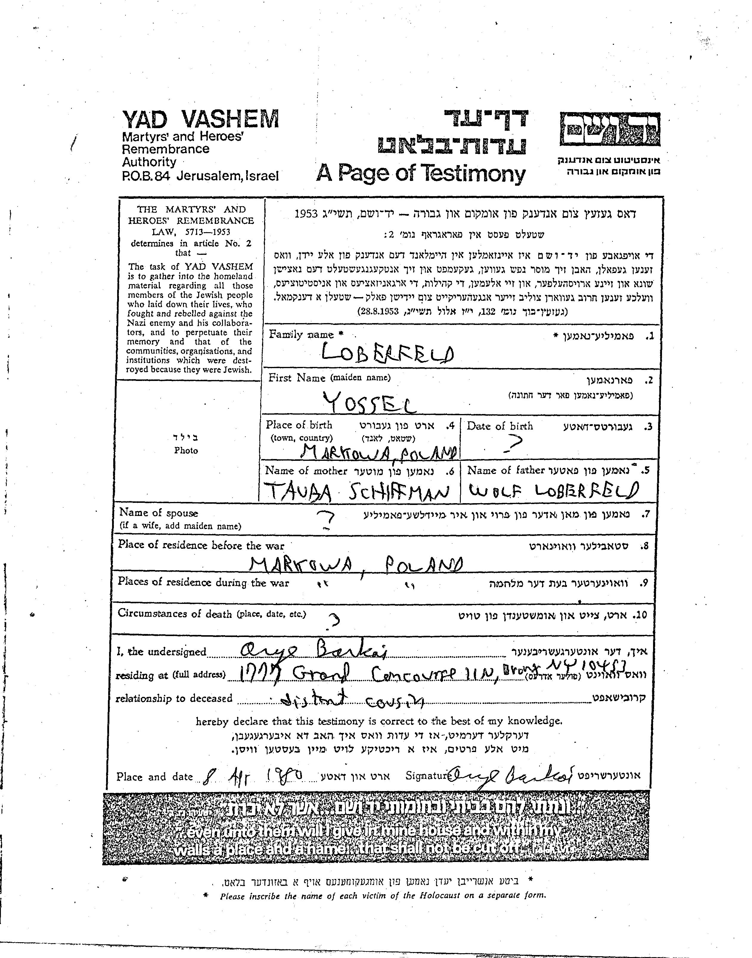 Yossel Loberfeld was born in Markowa, Poland to Wolf and Tauba. Prior to WWII he lived in Markowa, Poland. During the war he was in Markowa, Poland. Yossel was murdered in the Shoah.