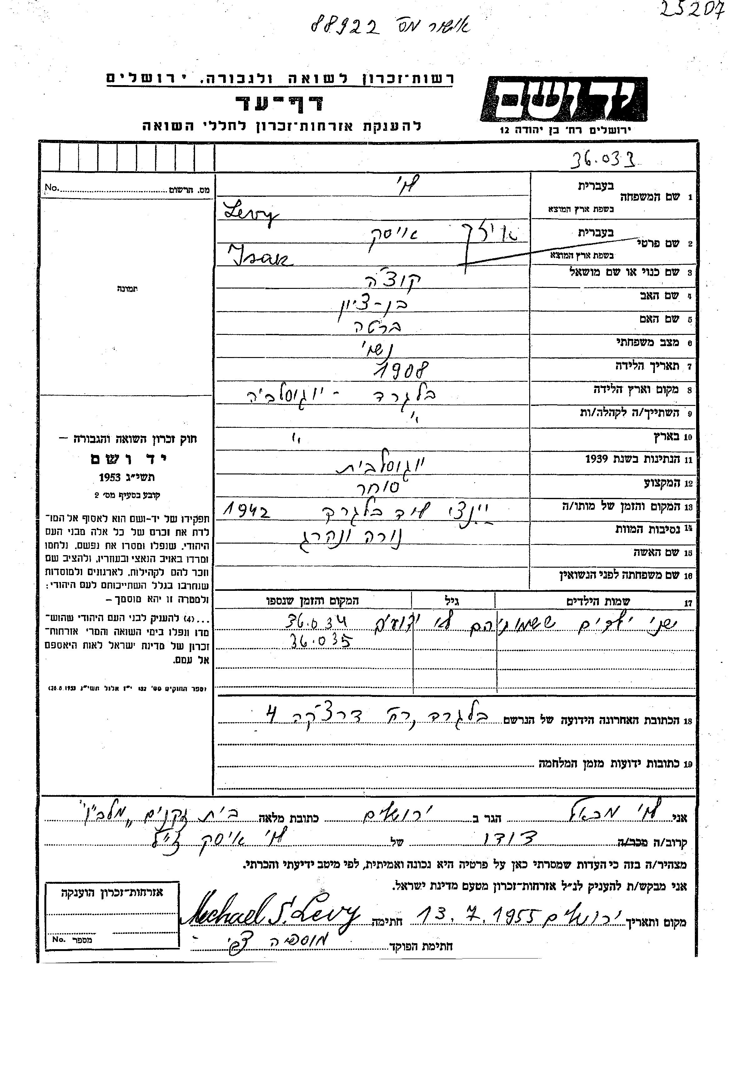 Izak Kuca Levy was born in Belgrad, Yugoslavia, 1908 to Bentzion and Berta. He was a merchant and married. Prior to WWII he lived in Belgrad, Yugoslavia. During the war he was in Belgrad, Yugoslavia. Izak Kuca was murdered in the Shoah. Place of death: Jajinci, Yugoslavia, 1942.