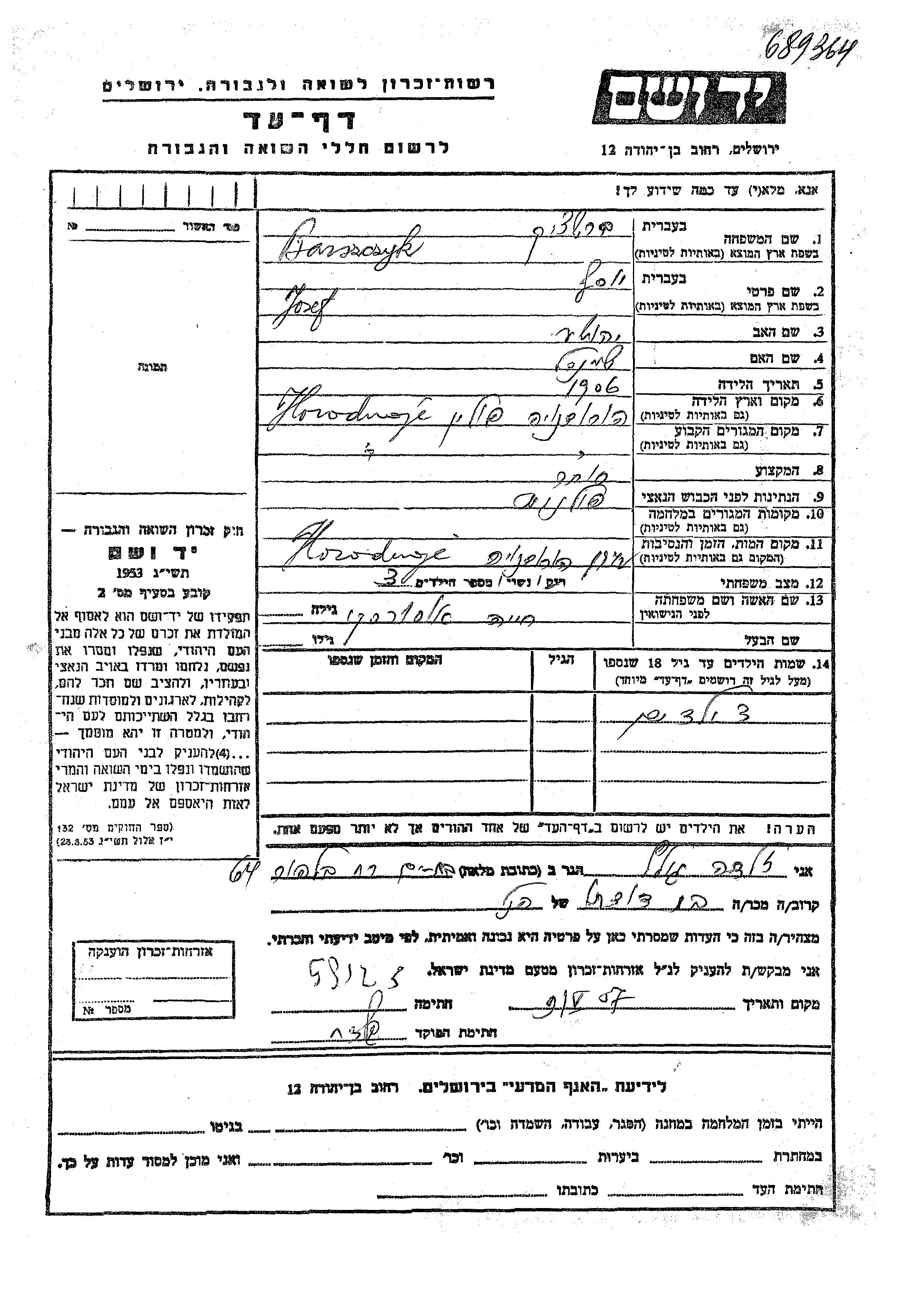 Josef Barszczyk was born in Horodnoje, Ukraine (USSR), 1906 to Yehoshua Yaakov and Sheindl. He was a merchant and married to Khaia nee Osovski. Prior to WWII he lived in Horodnoje, Ukraine (USSR). During the war he was in Horodnoje, Ukraine (USSR). Josef was murdered in the Shoah. Place of death: Horodnoje, Ukraine (USSR).