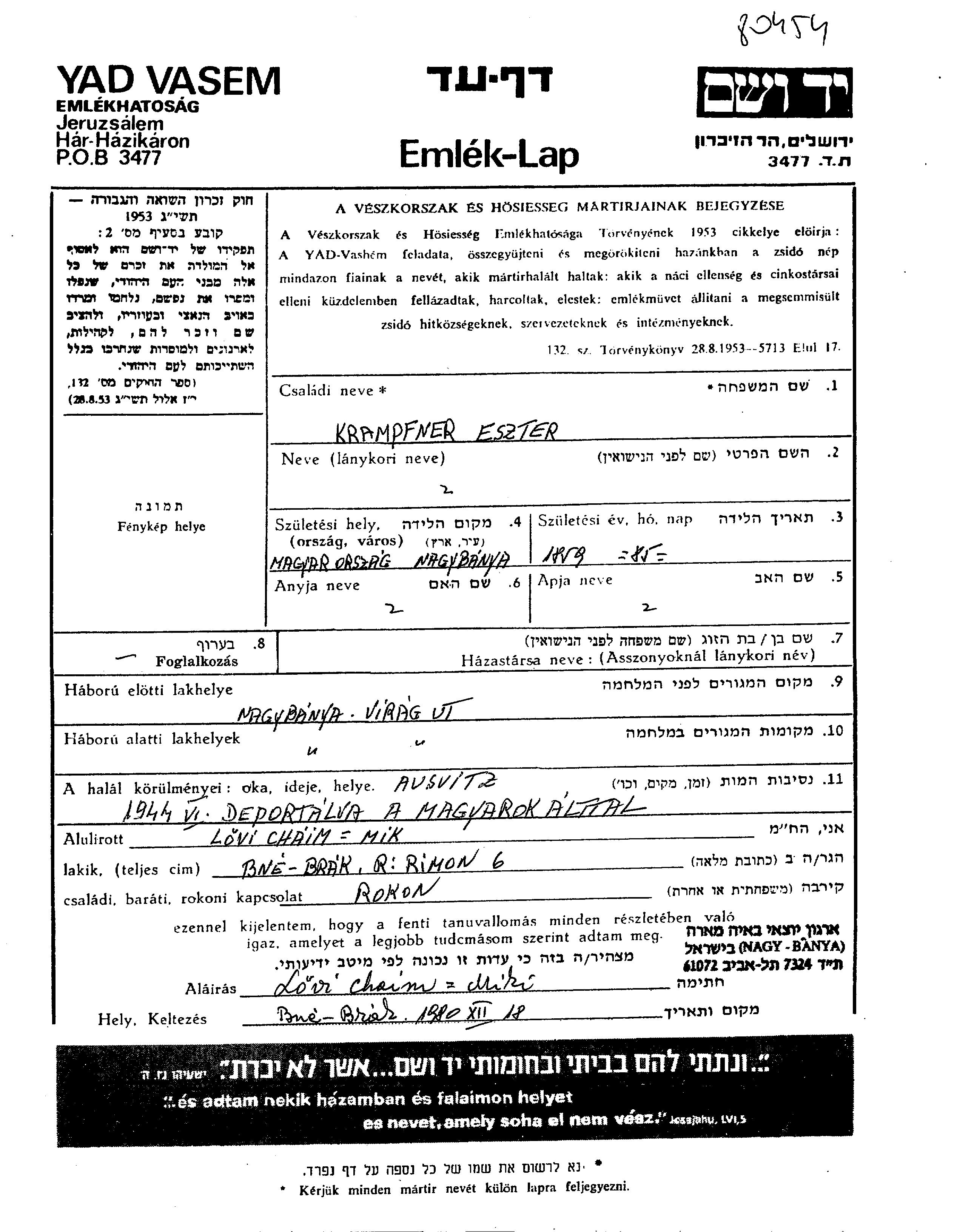 Eszter Krampfner was born in Nagybánya, Romania, 1859. Prior to WWII she lived in Nagybánya, Romania. During the war she was in Nagybánya, Romania. Eszter was murdered in the Shoah. Place of death: Auschwitz, Poland, 1944.