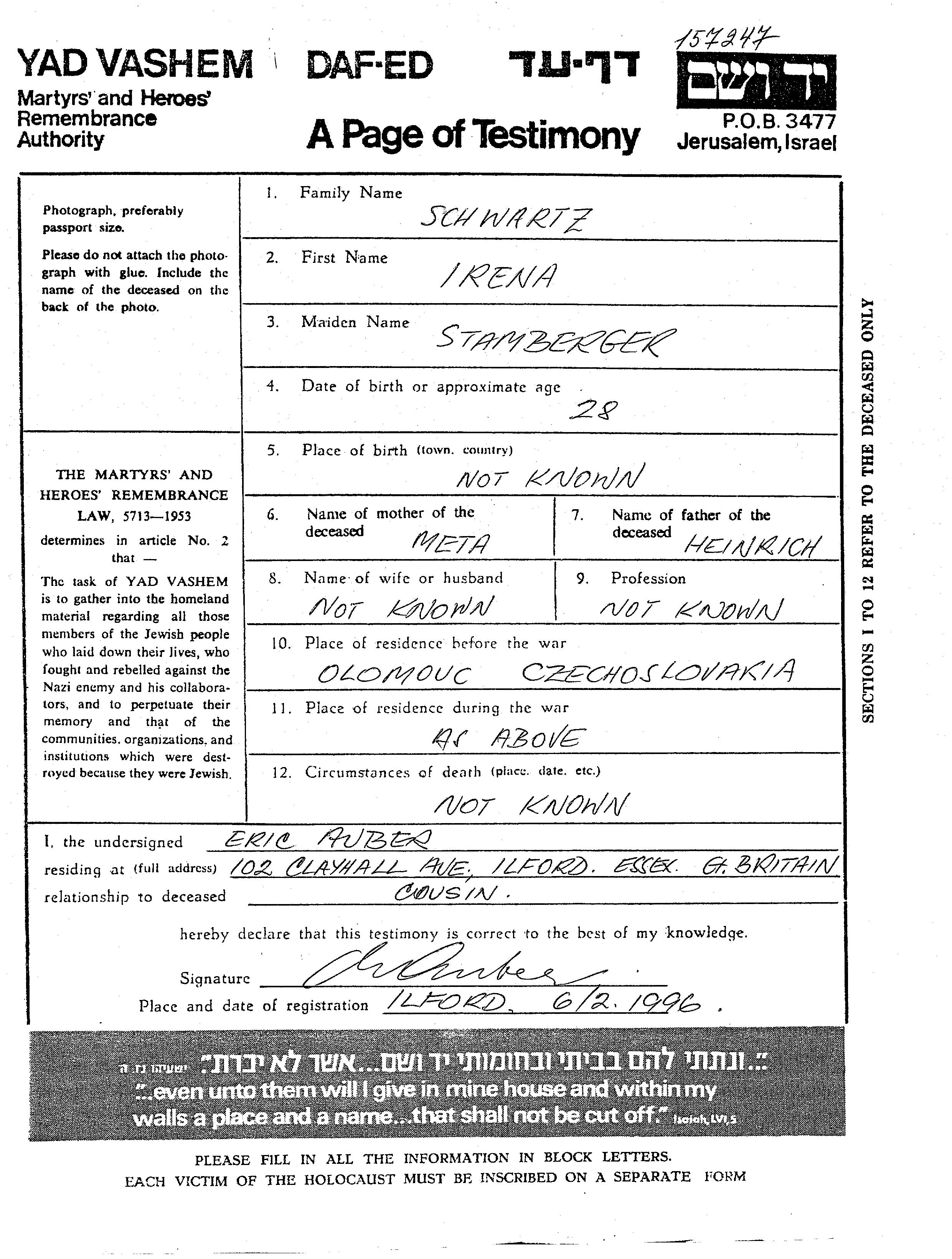 Schwartz Irena Olomouc, Czechoslovakia Page of Testimony