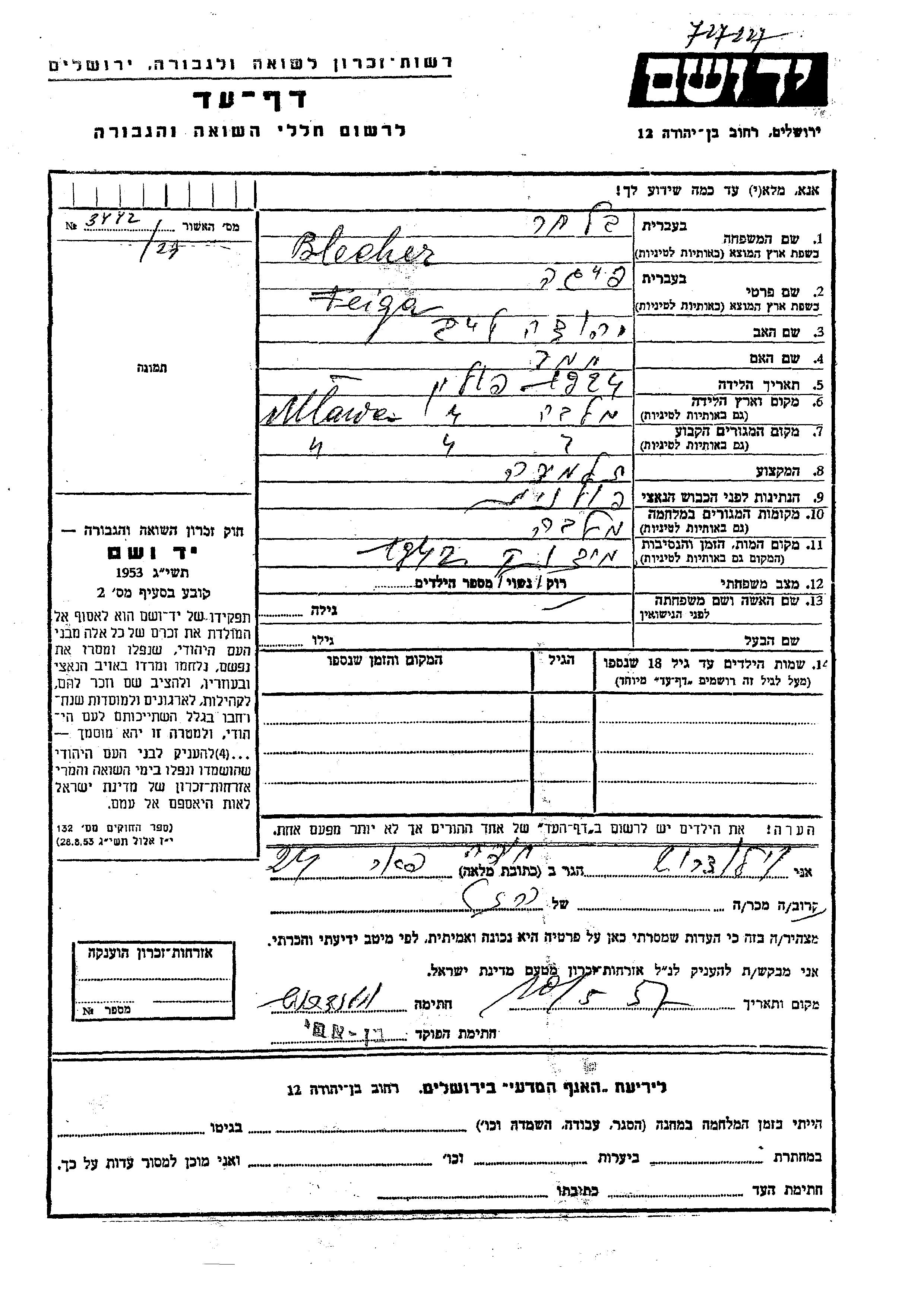 Feiga Blecher was born in Mlawa, Poland, 1924 to Yehuda Leib and Tamar. She was a pupil and single. Prior to WWII she lived in Mlawa, Poland. During the war she was in Mlawa, Poland. Feiga was murdered in the Shoah. Place of death: Majdanek, Poland, 1942.