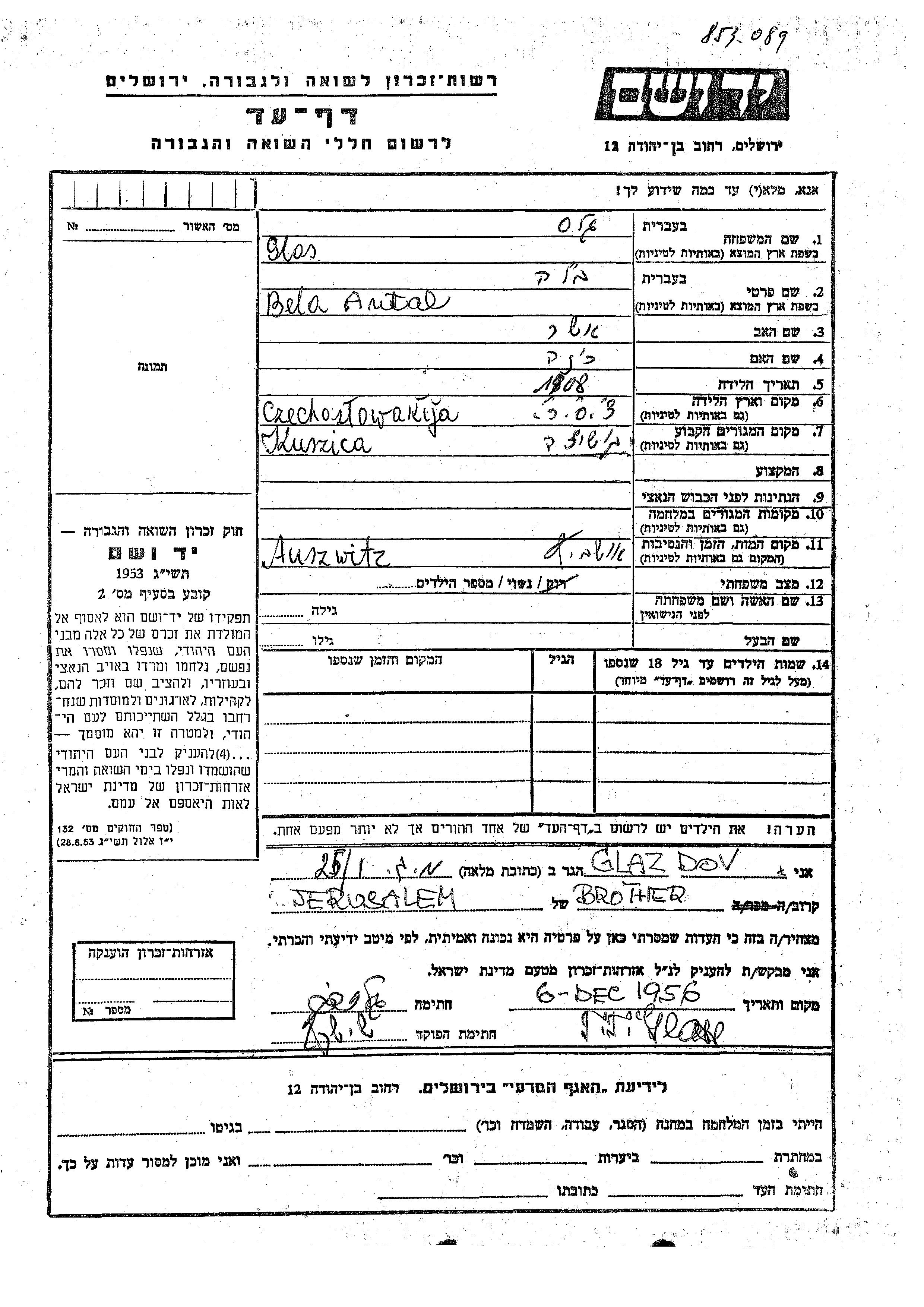 Glas Antal Bela 1908 Koszyce, Poland Page of Testimony