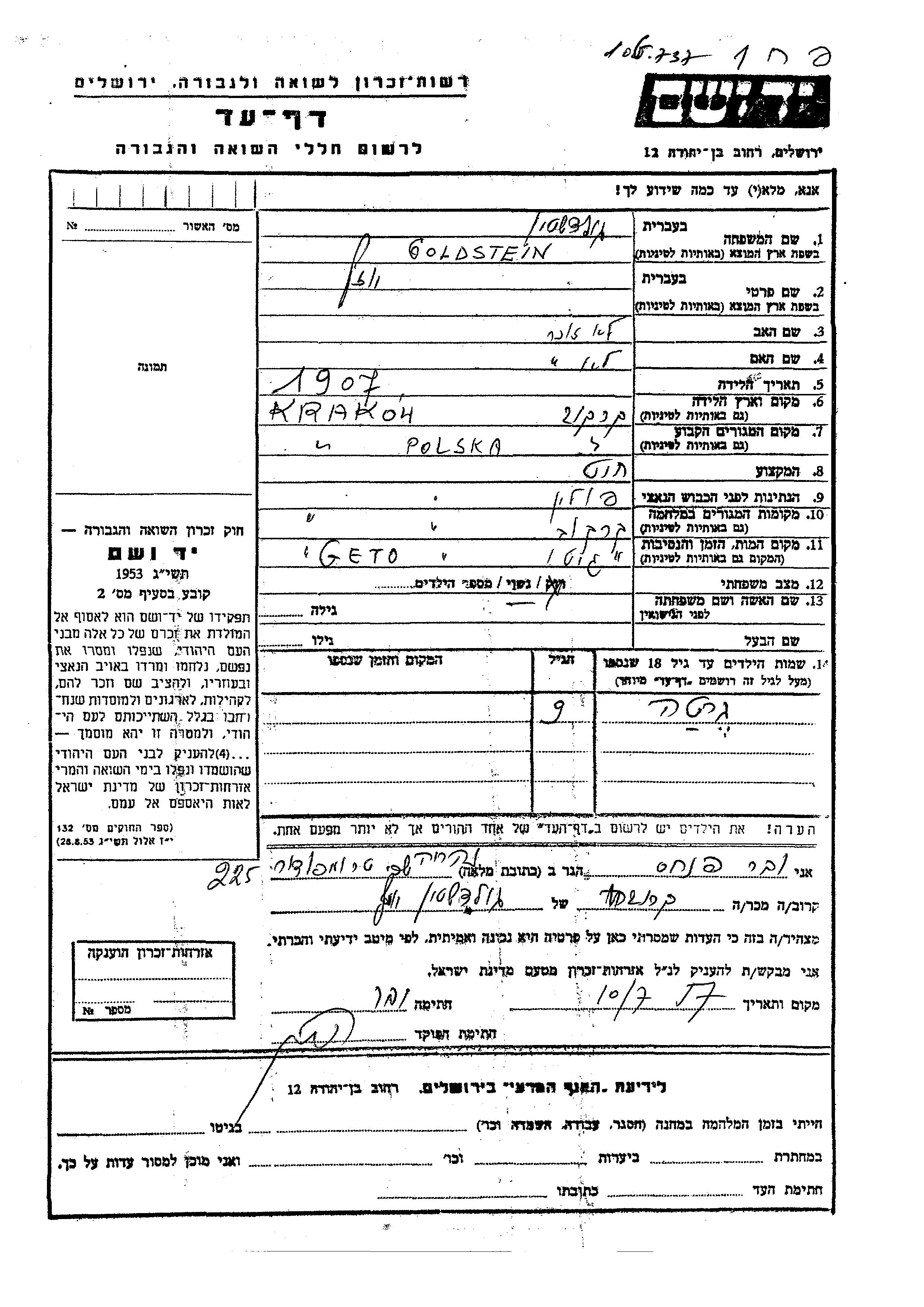 Goldstein Iozef 1907 Krakow, Poland Page of Testimony