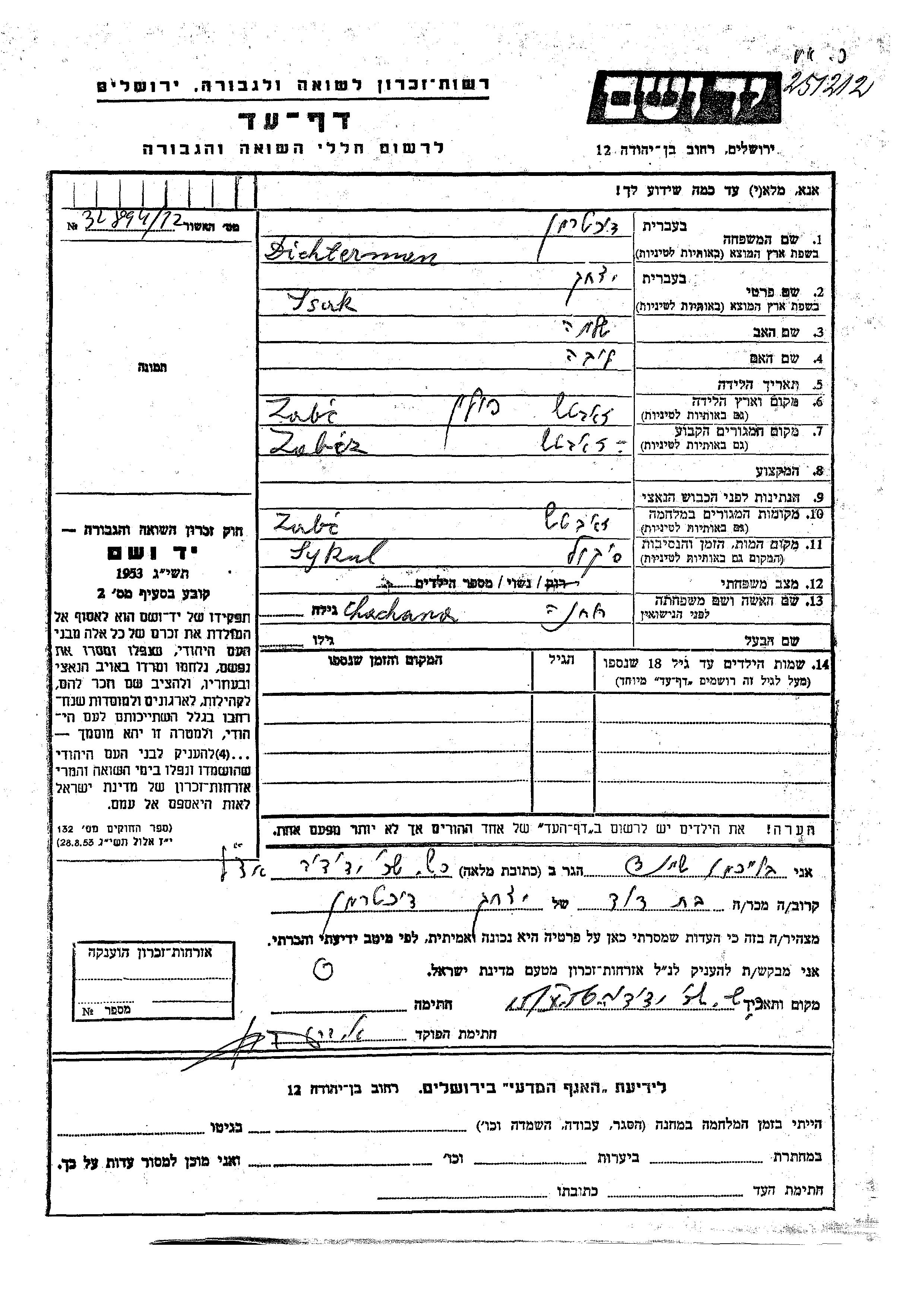 Dichterman Isak Zabcze Murowane, Poland Page of Testimony
