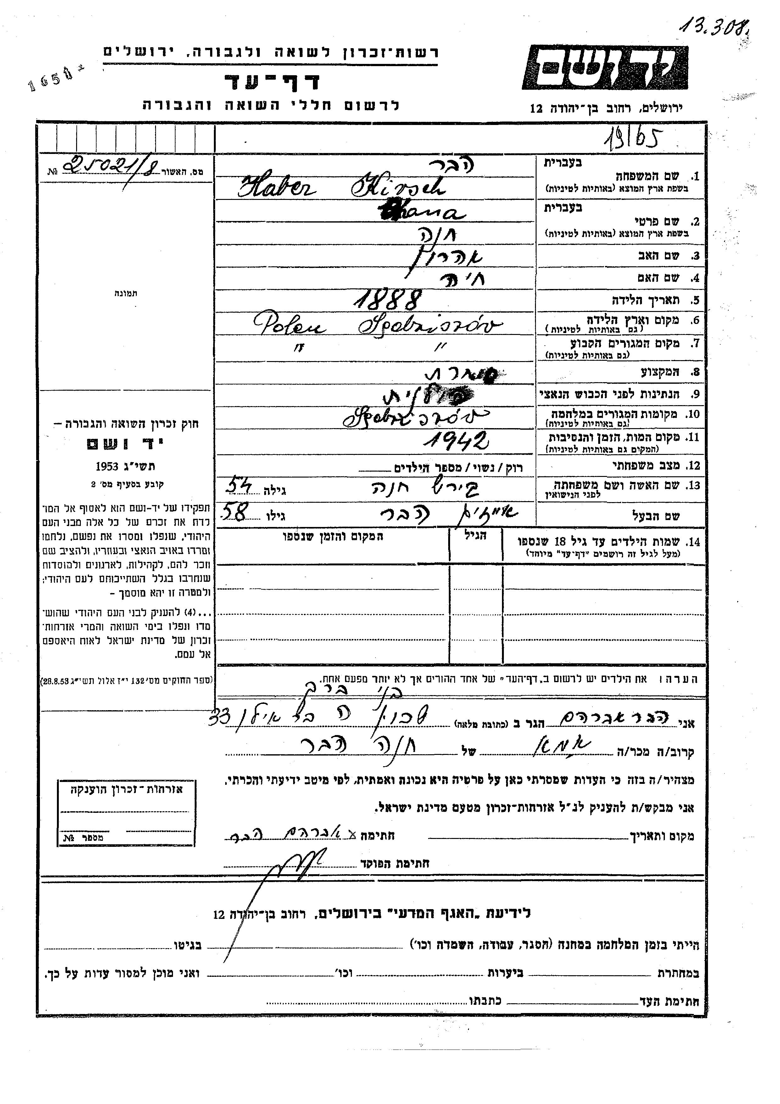 Hana Kirsch Haber nee Girsh was born in Sedziszow Malopolski, Poland, 1888 to Aharon and Khaia. She was a merchant. Prior to WWII she lived in Sedziszow Malopolski, Poland. During the war she was in Sedziszow Malopolski, Poland. Hana was murdered in the Shoah. Place of death: unknown, 1942.