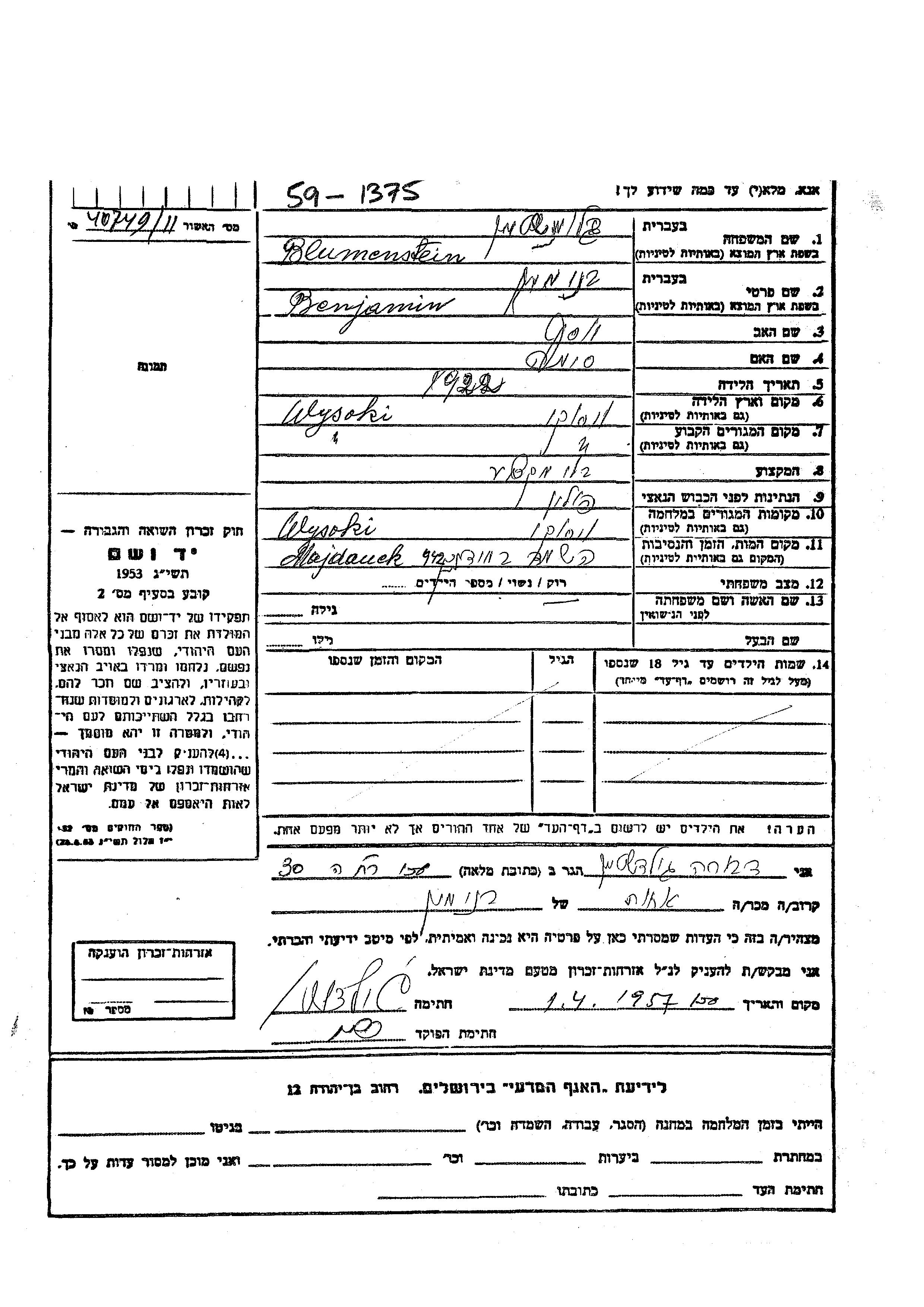 Benjamin Blumenstein was born in Wysoki Brzeg, Poland, 1922 to Yosef and Sima. He was single. Prior to WWII he lived in Wysoki Brzeg, Poland. During the war he was in Wysoki Brzeg, Poland. Benjamin was murdered in the Shoah. Place of death: Majdanek, Poland, 1942.