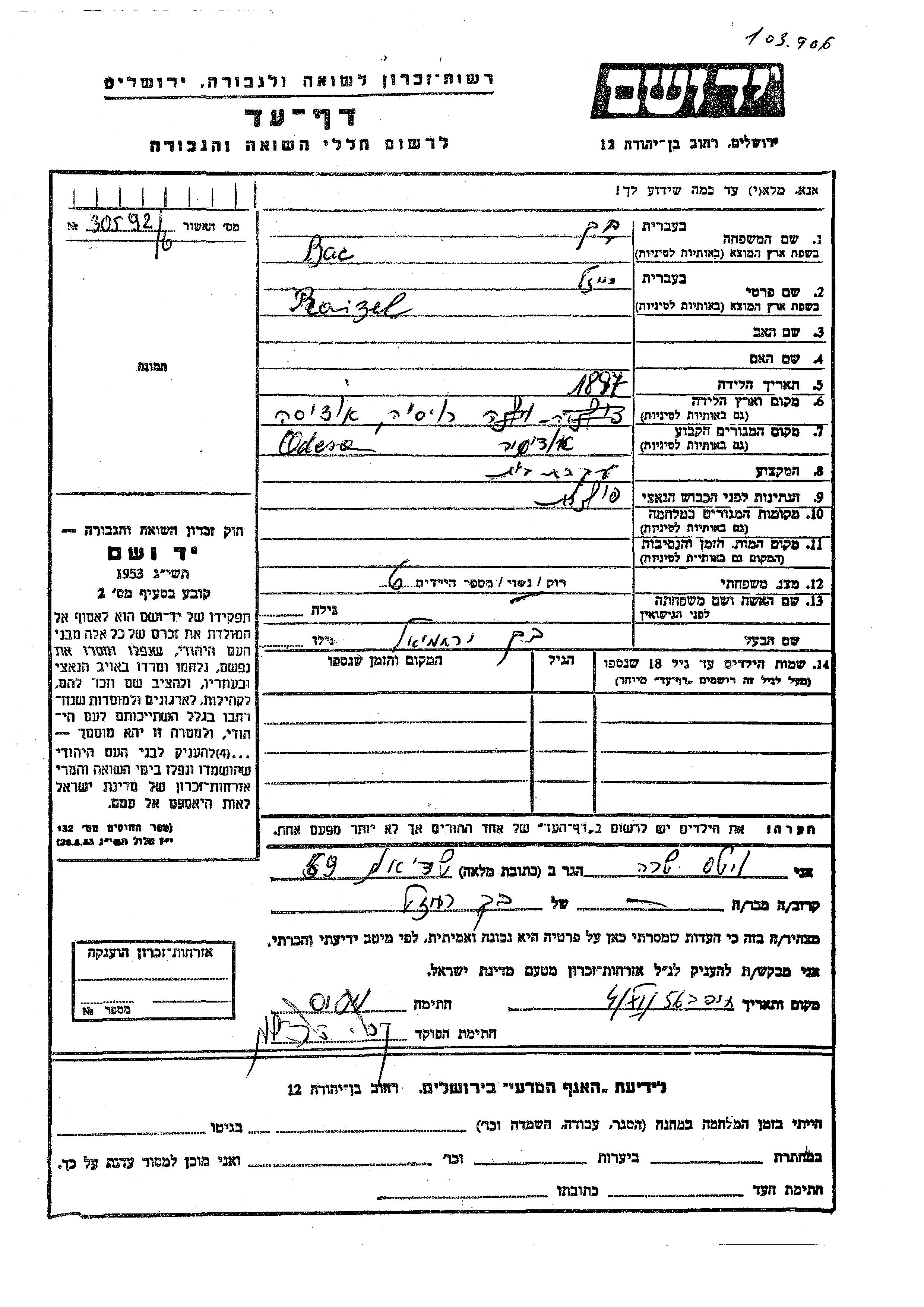 Bac Bek Buk Raizel 1897 Odessa, Ukraine (USSR) Page of Testimony
