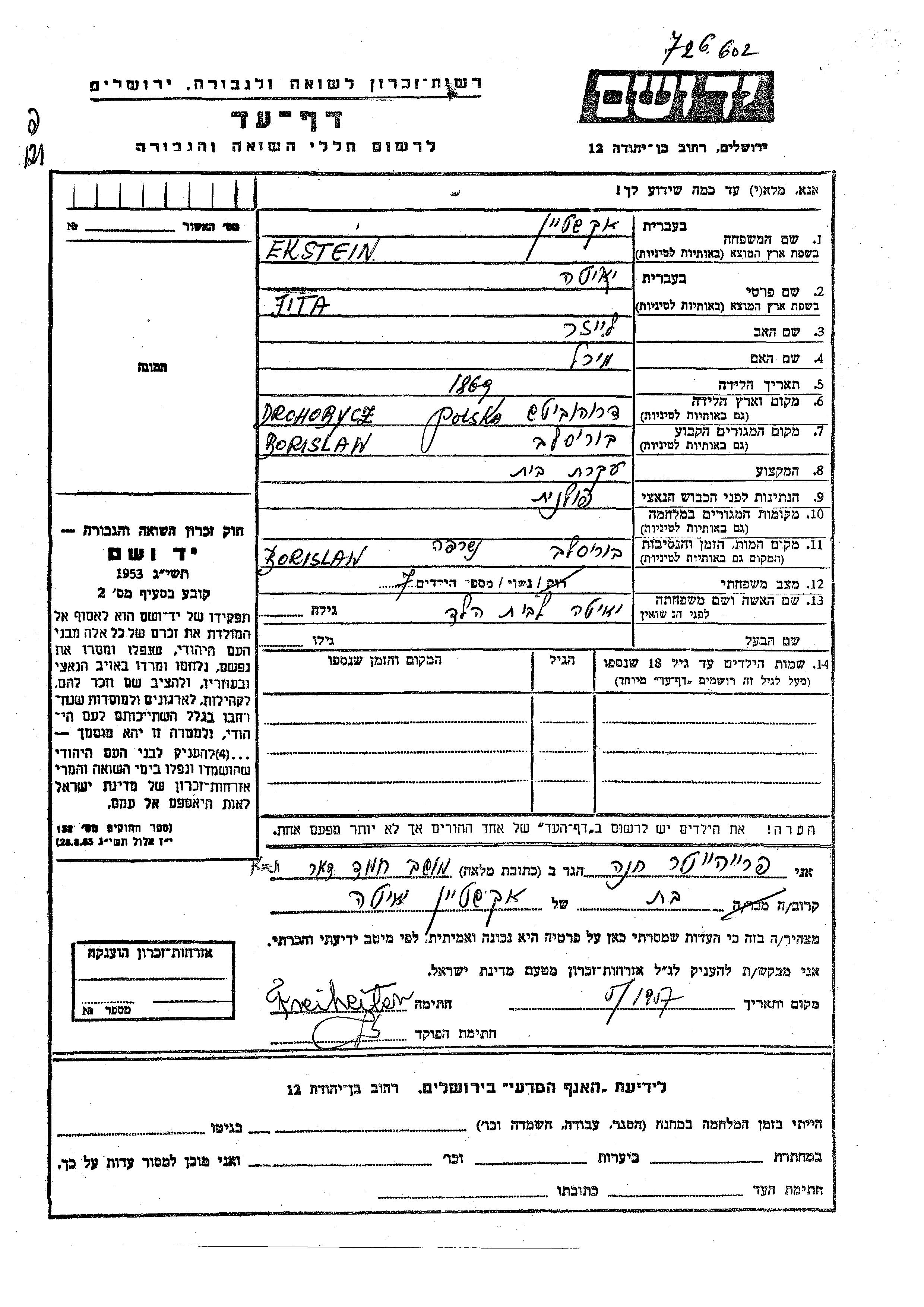 Ekstein Jita 1869 unstated place, Page of Testimony