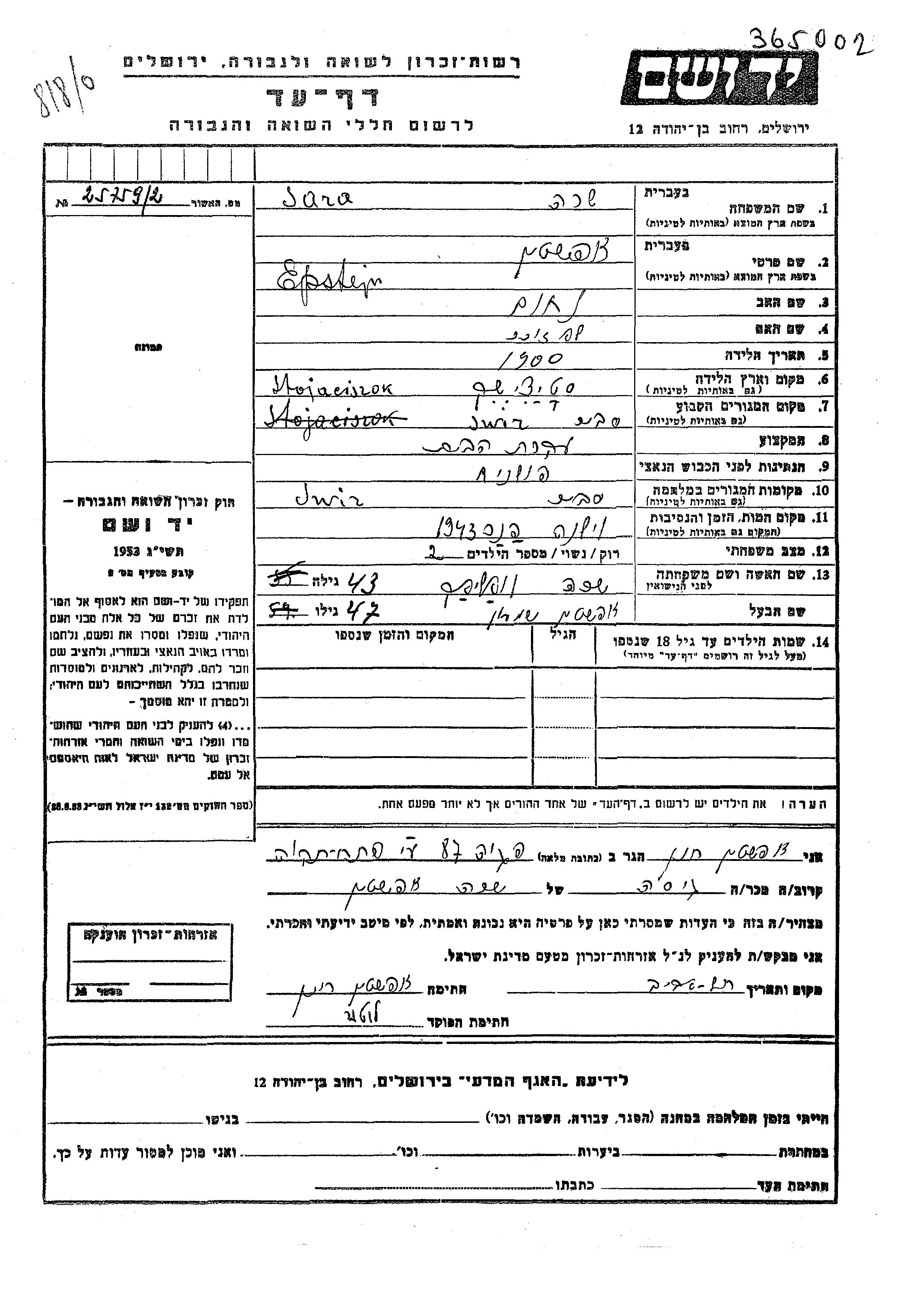 Sara Epstein nee Valakh was born in Stojaciszki, Poland, 1900 to Nakhum. She was a housewife. Prior to WWII she lived in Stojaciszki, Poland. During the war she was in Swir, Poland. Sara was murdered in the Shoah. Place of death: Ponary Area, Poland, 1943.