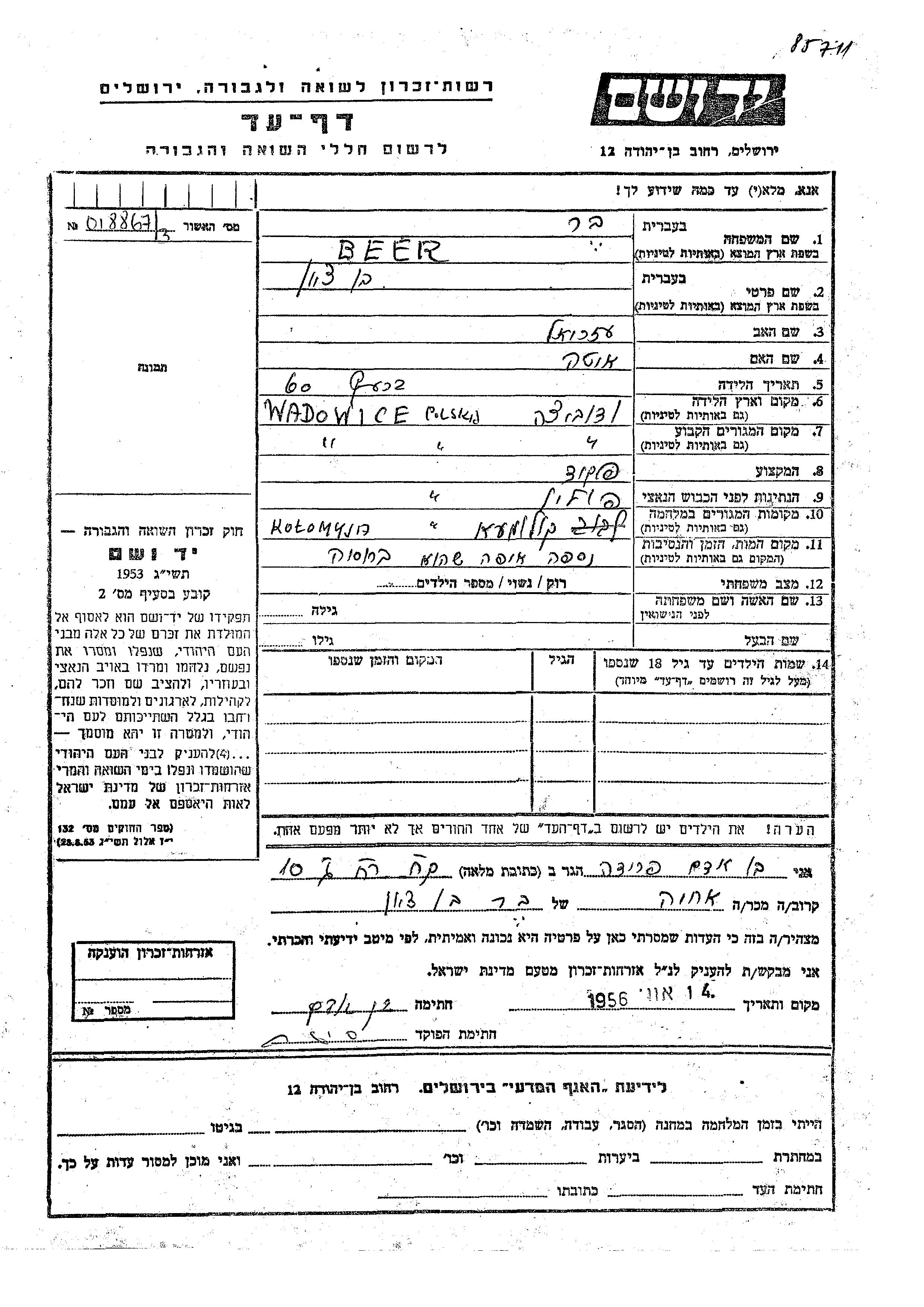 Bentzion Beer was born in Wadowice, Poland to Azriel and Ita. He was a clerk. Prior to WWII he lived in Wadowice, Poland. During the war he was in Kolomyja, Poland. Bentzion was murdered in the Shoah. Place of death: Russia (USSR).
