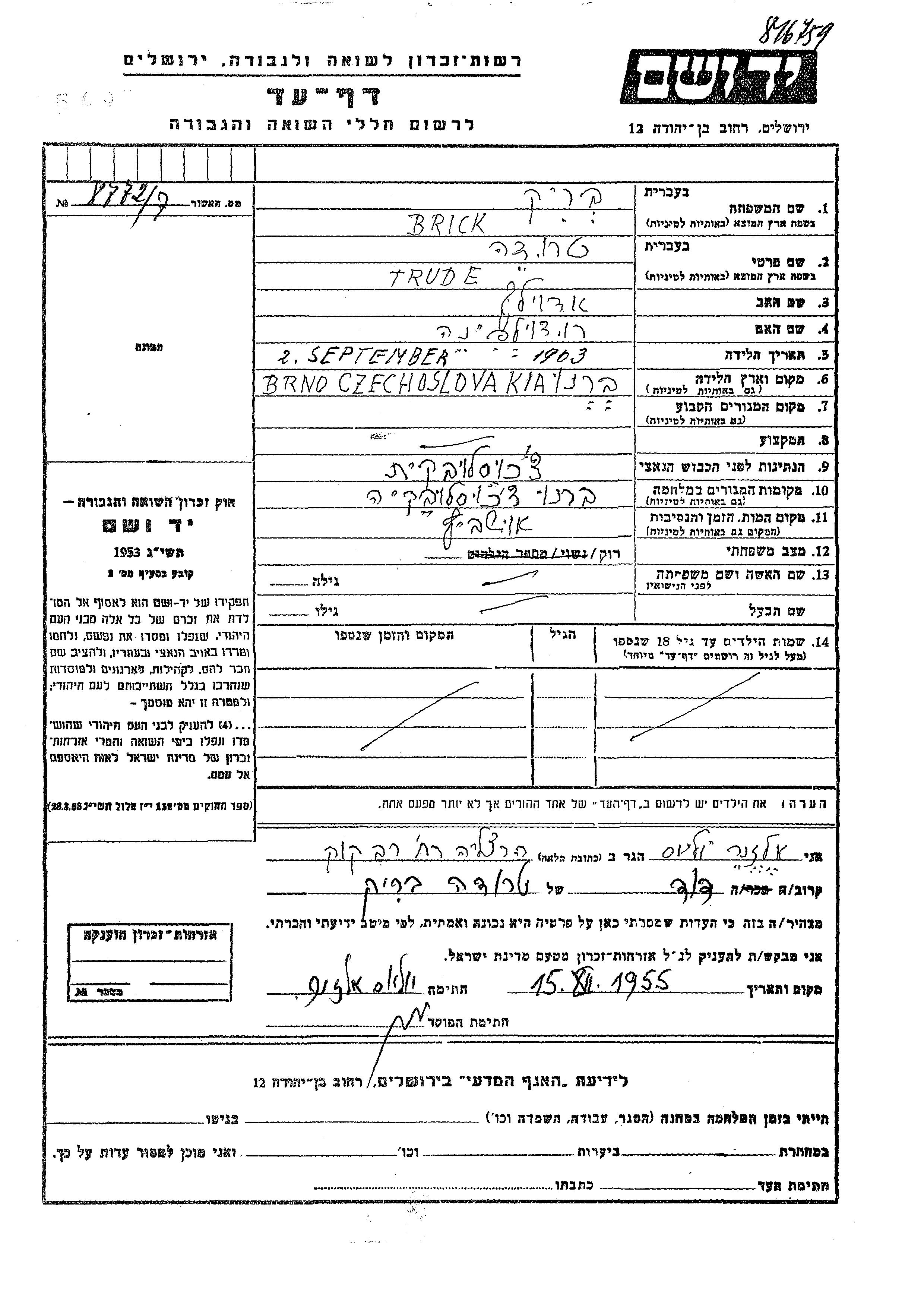 Trude Brick was born in Brno, Czechoslovakia, 1903 to Adolf and Rudolfina. She was single. During the war she was in Brno, Czechoslovakia.