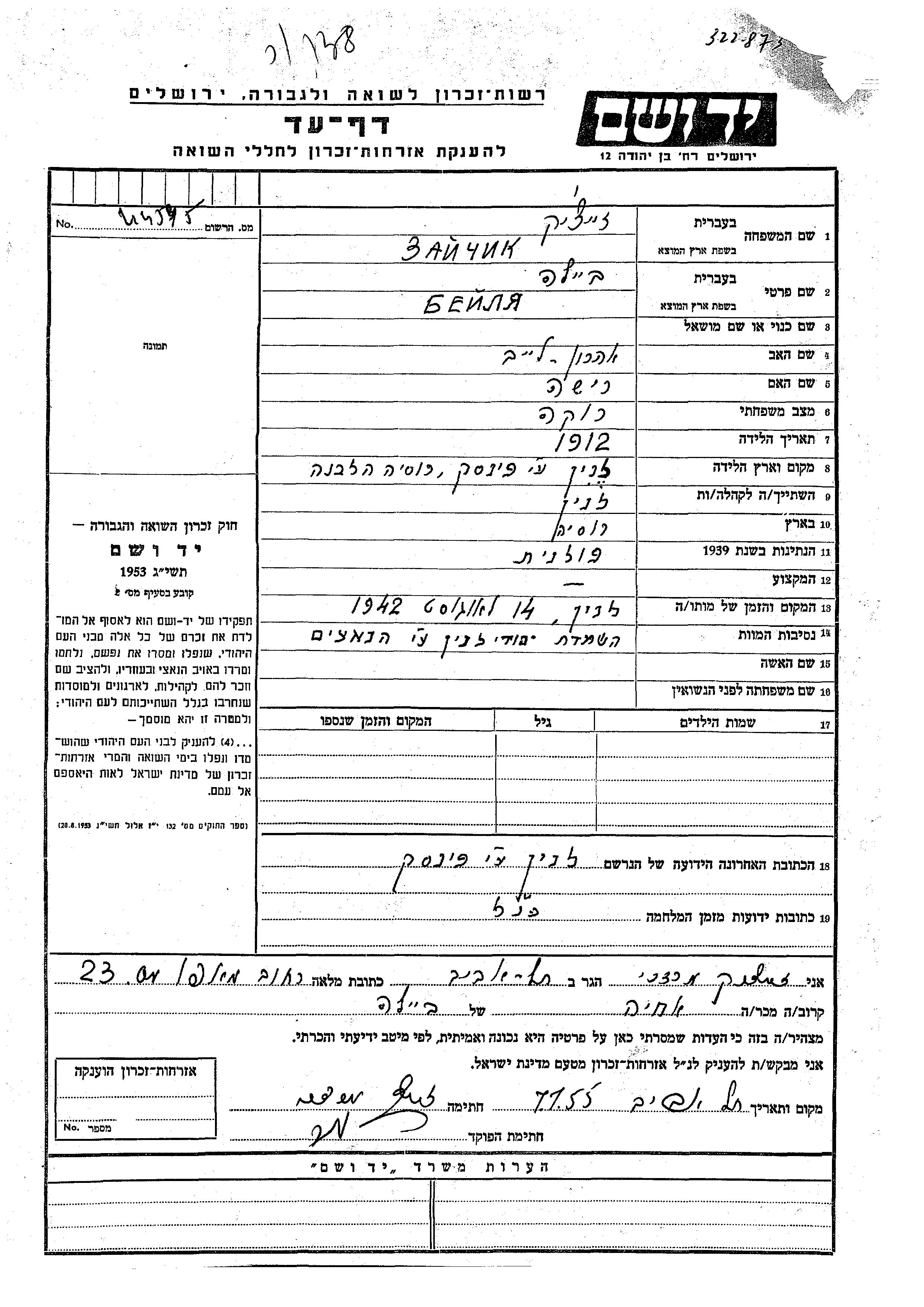 Beila Zaichik was born in Znin, Poland, 1912 to Aharon Leib and Risha. Prior to WWII she lived in Znin, Poland. During the war she was in Znin, Poland. Beila was murdered in the Shoah. Place of death: Znin, Poland, 14/08/1942.