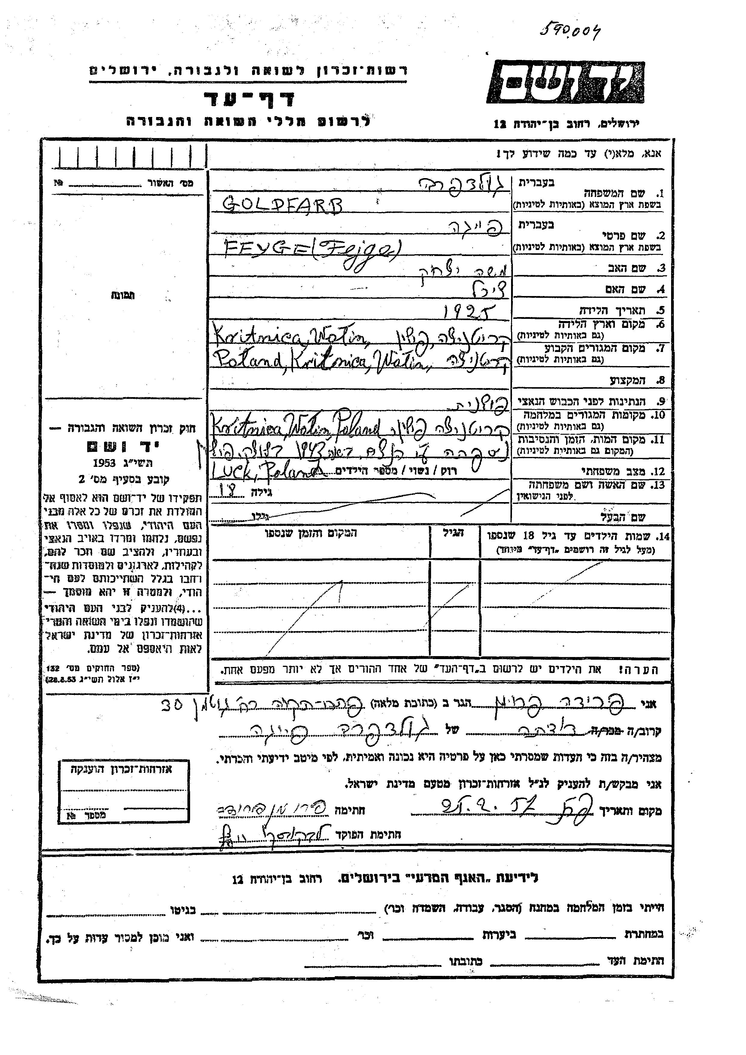 Feyge Goldfarb was born in Korytnica, Poland, 1925 to Moshe Yitzkhak and Tzirel. Prior to WWII she lived in Korytnica, Poland. During the war she was in Korytnica, Poland. Feyge was murdered in the Shoah. Place of death: Luck, Poland, 1943.