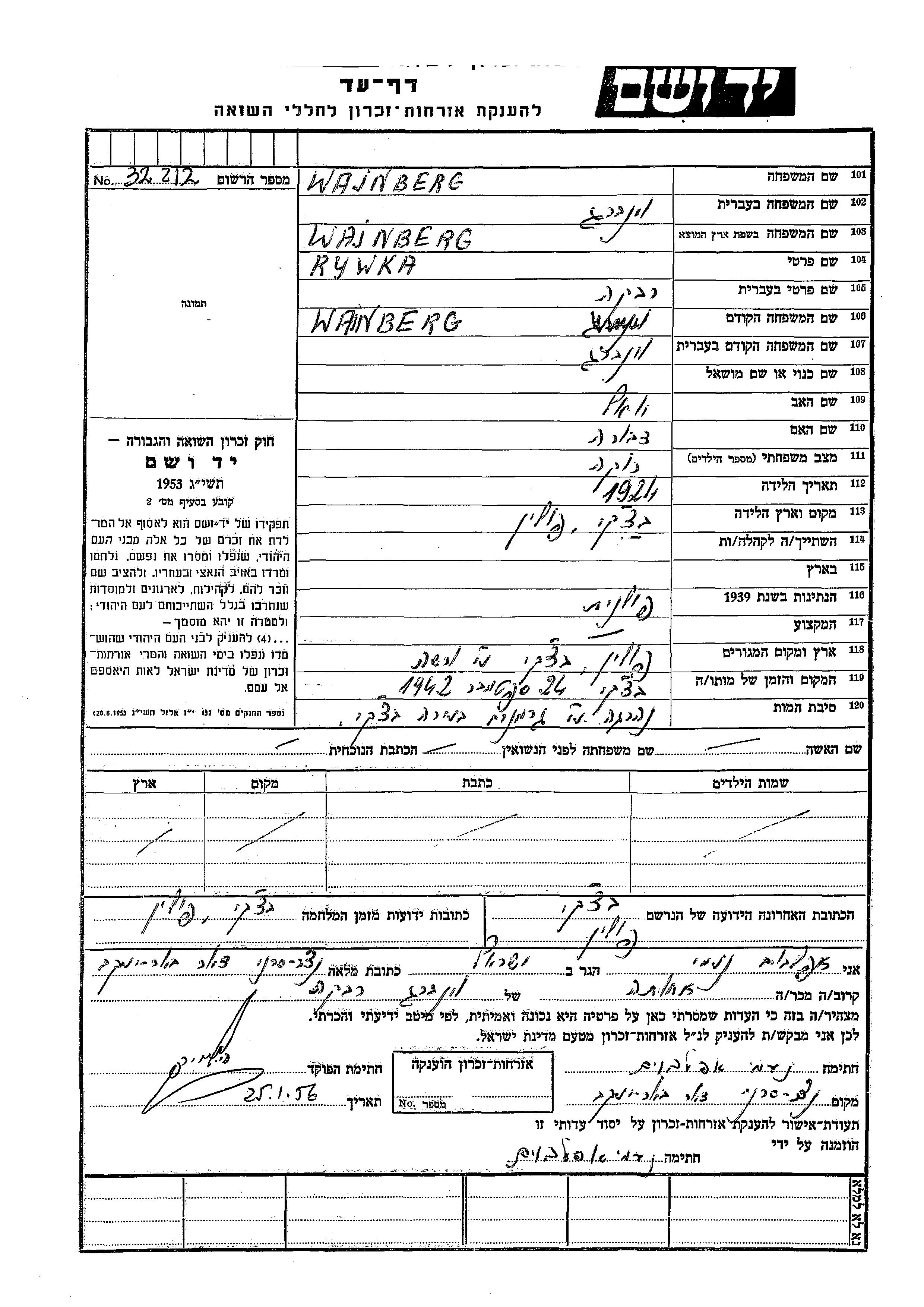 Rywka Wajnberg was born in Baczki, Poland, 1924 to Yosef and Dvora. She was single. Prior to WWII she lived in Baczki, Poland. During the war she was in Baczki, Poland. Rywka was murdered in the Shoah. Place of death: Baczki, Poland, 1942.