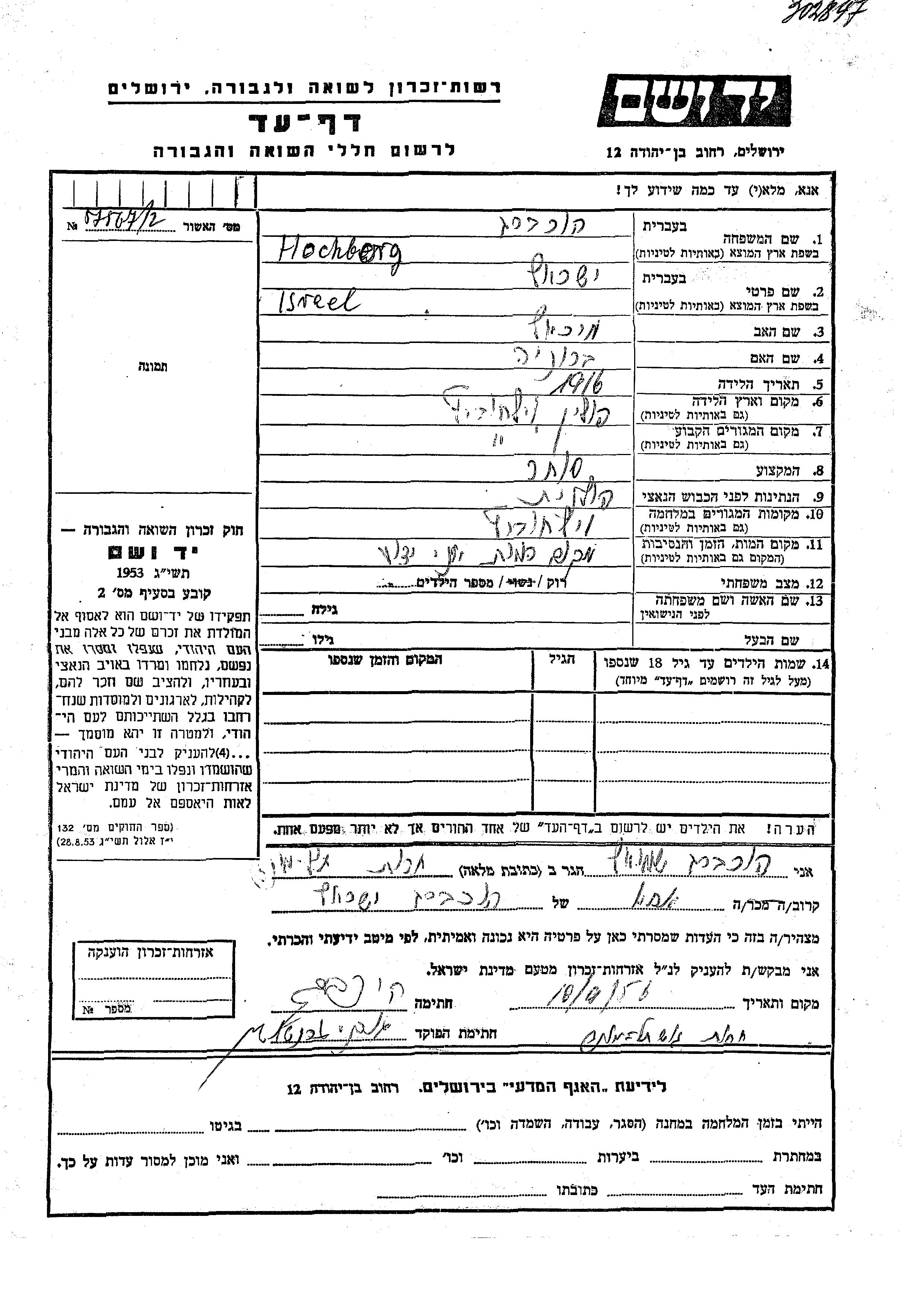 Hochberg Israel 1916 Olchowiec, Poland Page of Testimony