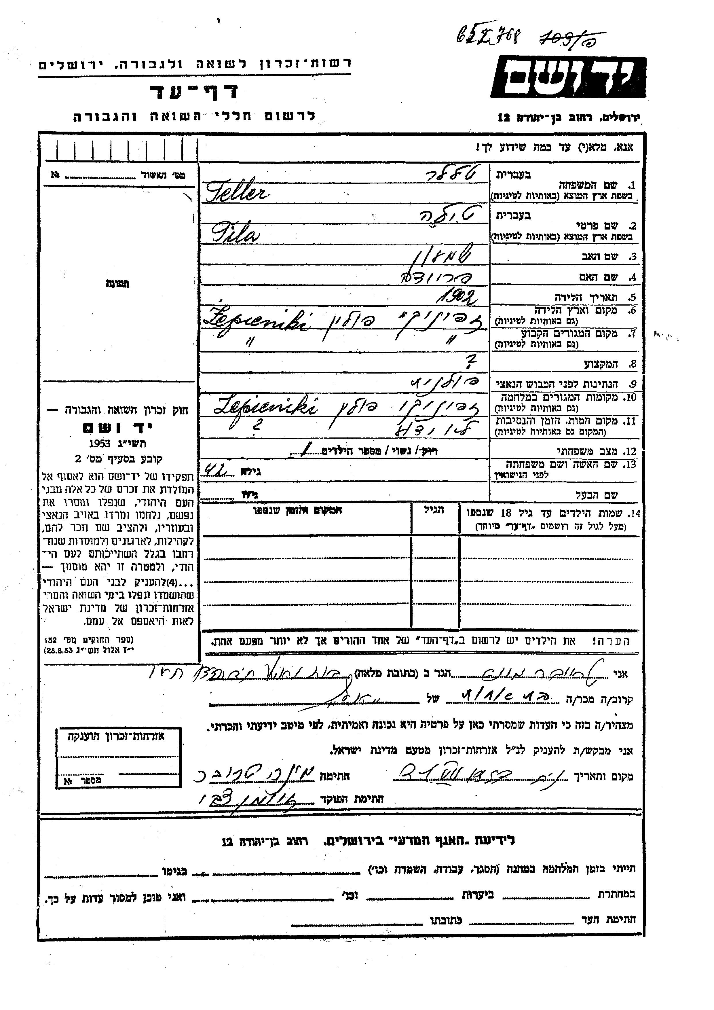 Tila Teller Taler was born in Rzepiennik Strzyzewski, Poland, 1902 to Shimon and Freida. She was married. Prior to WWII she lived in Rzepiennik Strzyzewski, Poland. During the war she was in Rzepiennik Strzyzewski, Poland. Tila was murdered in the Shoah.
