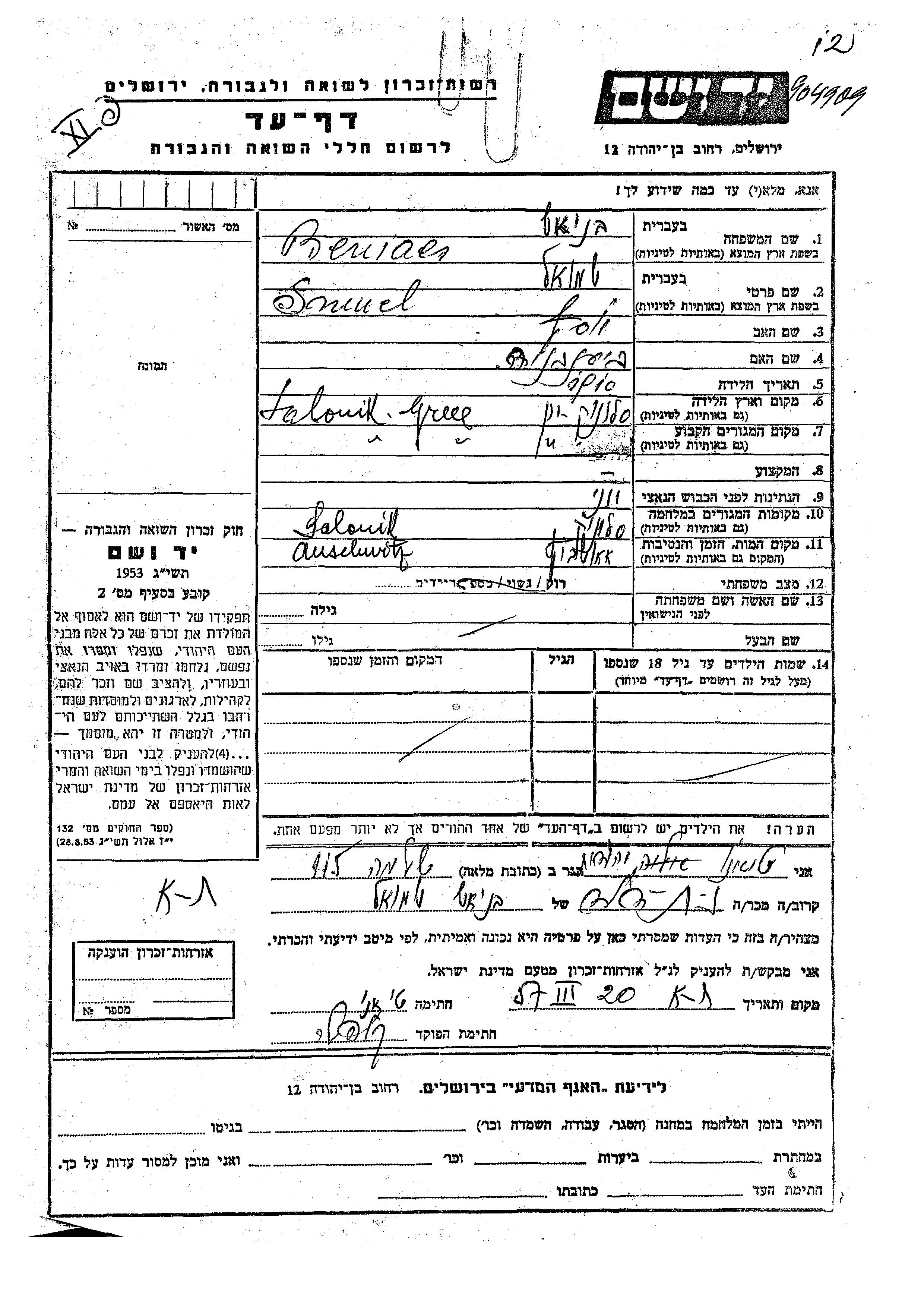 Beniacs Smuel 1910 Salonika, Greece Page of Testimony