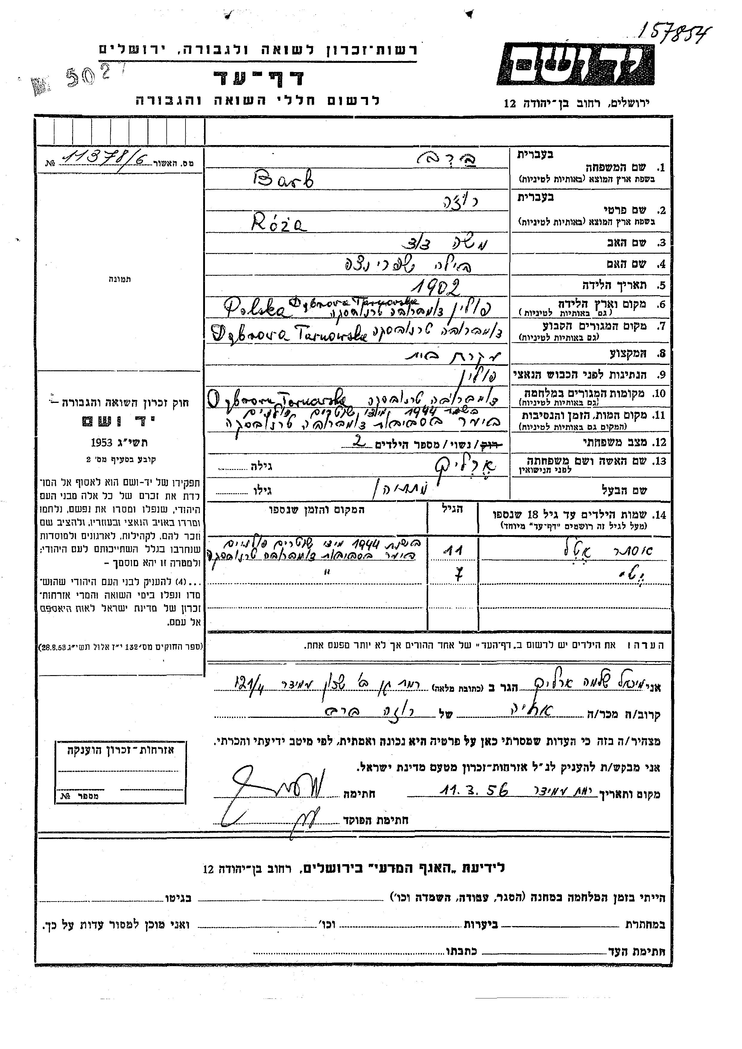 Barb Roza 1902 Dombrova, Poland Page of Testimony