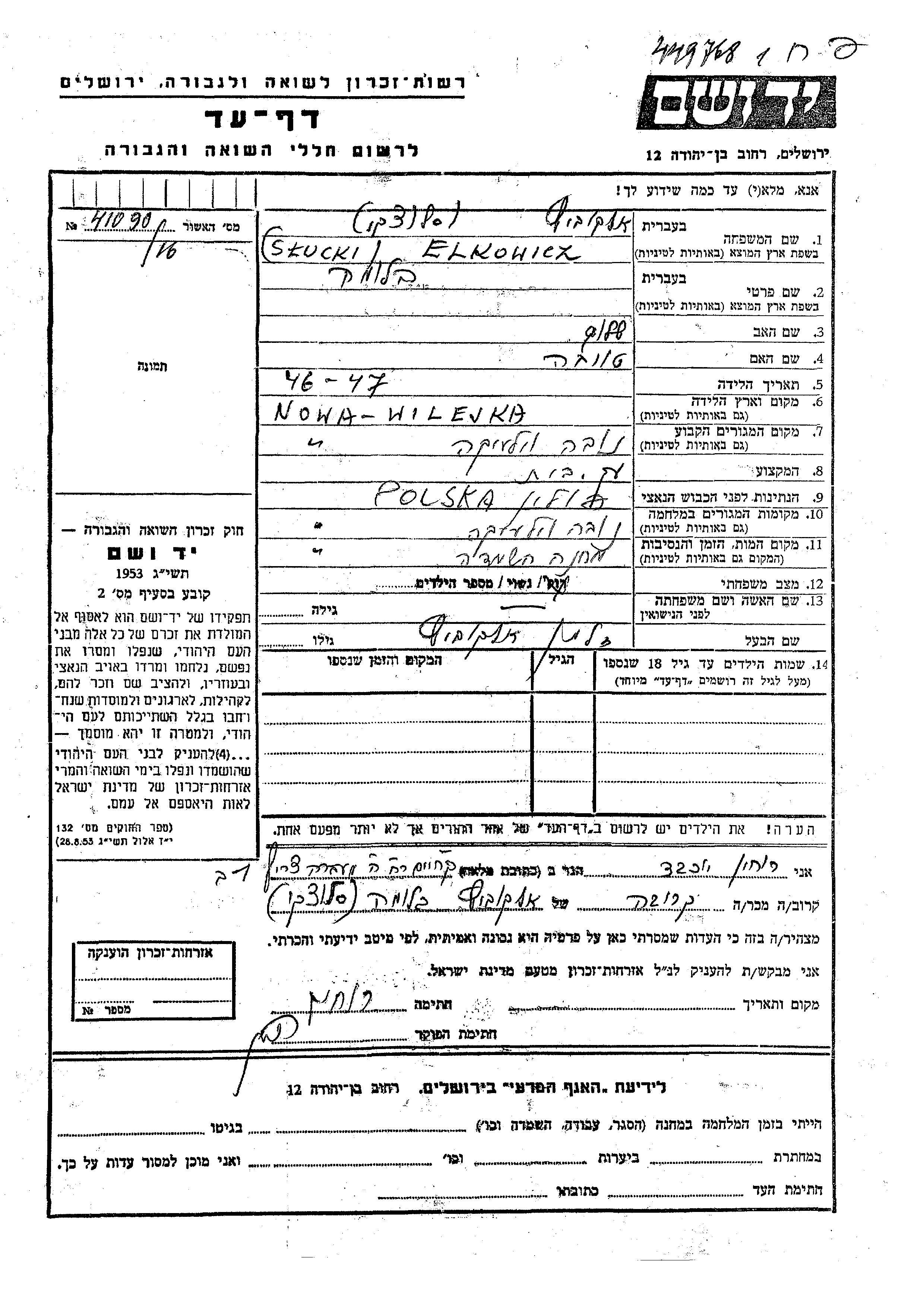 Bluma Elkowicz nee Slucki was born in Nowa Wilejka, Poland to Shalom and Tauba. She was a housewife and married to Zalman. Prior to WWII she lived in Nowa Wilejka, Poland. During the war she was in Nowa Wilejka, Poland. Bluma was murdered in the Shoah. Place of death: Nowa Wilejka, Poland.