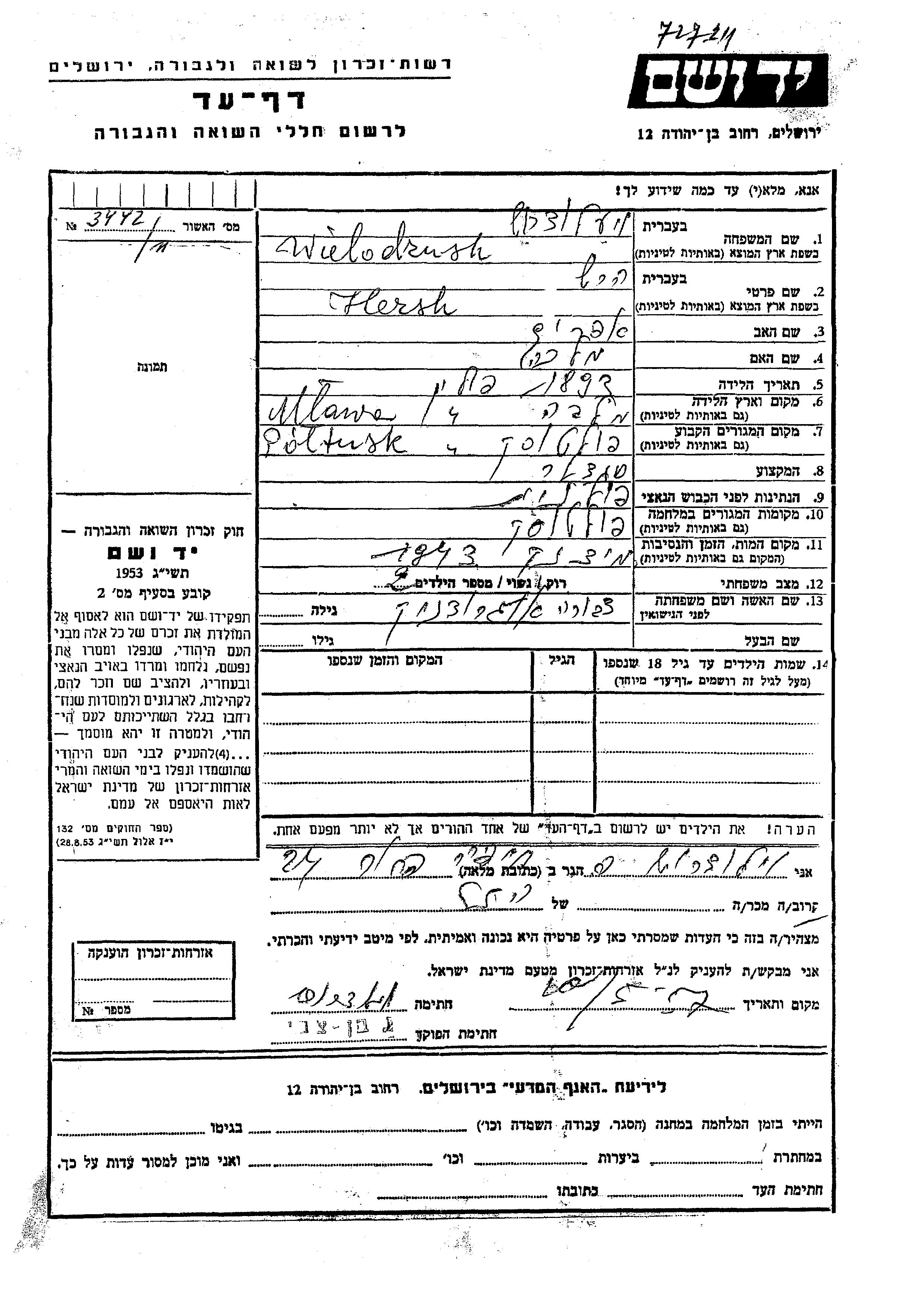 Hersh Wielodrush was born in Mlawa, Poland, 1893 to Efraim and Malka. He was a shoemaker and married to Dvora nee Ogrodnik. Prior to WWII he lived in Pultusk, Poland. During the war he was in Poltusk, Poland. Hersh was murdered in the Shoah. Place of death: Majdanek, Poland, 1943.