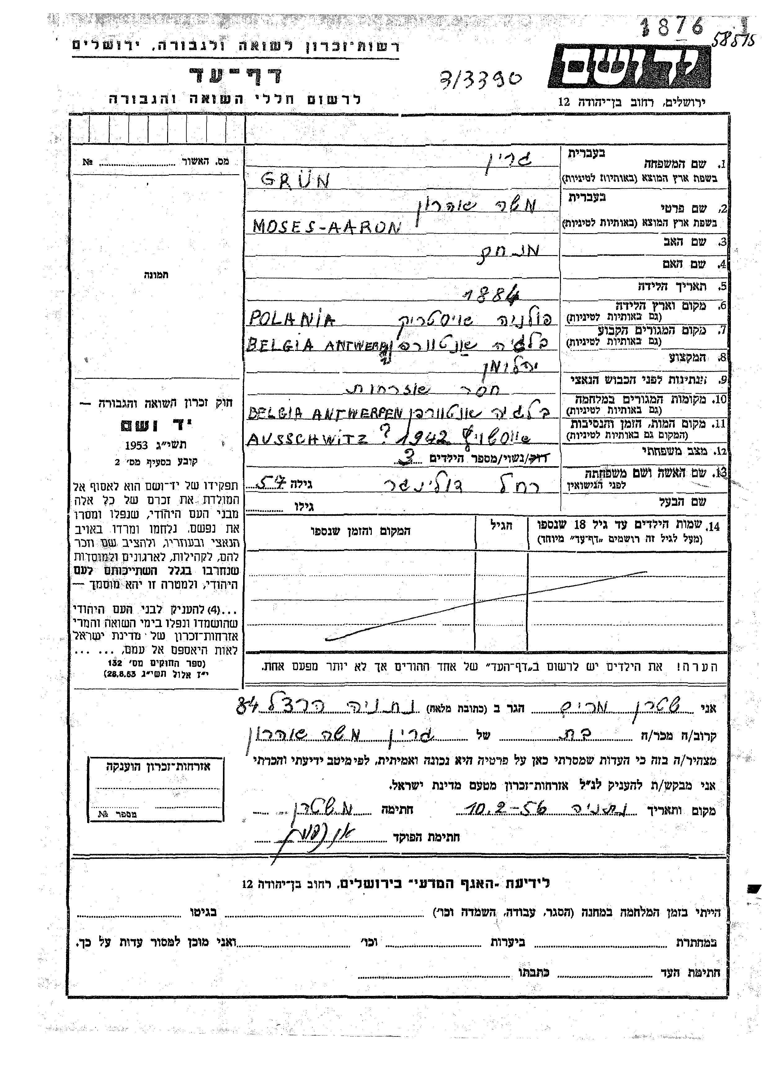 Moses Aaron Gruen was born in Ustrzyki Dolne, Poland, 1884 to Menakhem. He was a diamond merchant/cutter and married to Rakhel nee Dolinger. Prior to WWII he lived in Antwerpen, Belgium. During the war he was in Antwerpen, Belgium. Moses Aaron was murdered in the Shoah. Place of death: Auschwitz, Poland, 1942.