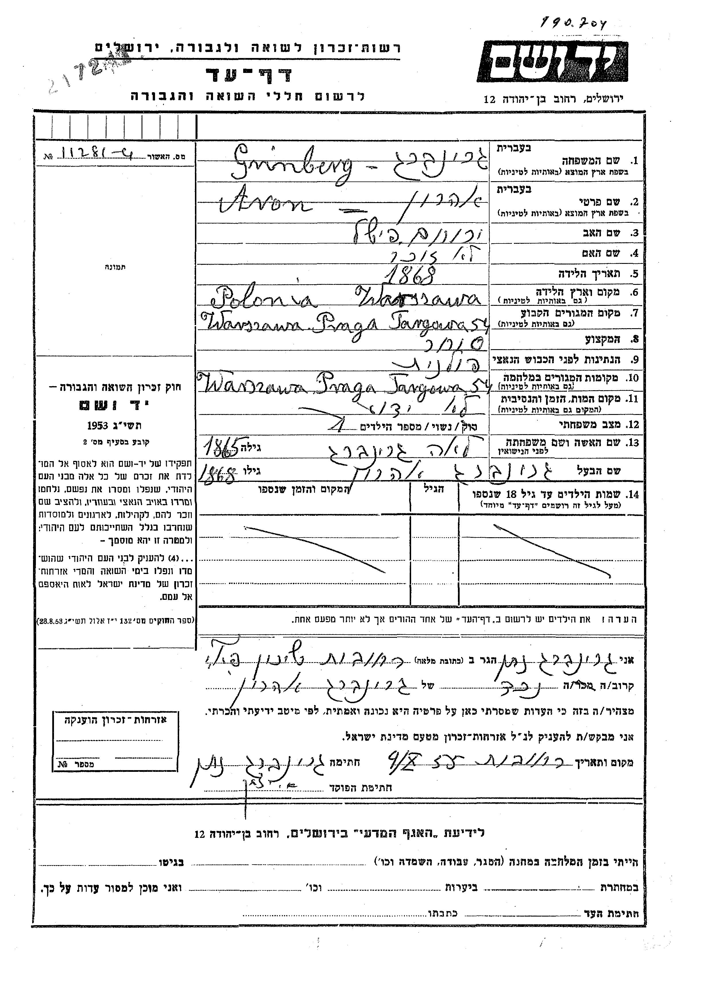Aron Grinberg was born in Warsaw, Poland, 1868 to Yerukham Fishel. He was a merchant and married to Lea. Prior to WWII he lived in Warsaw, Poland. During the war he was in Warsaw, Poland. Aron was murdered in the Shoah.