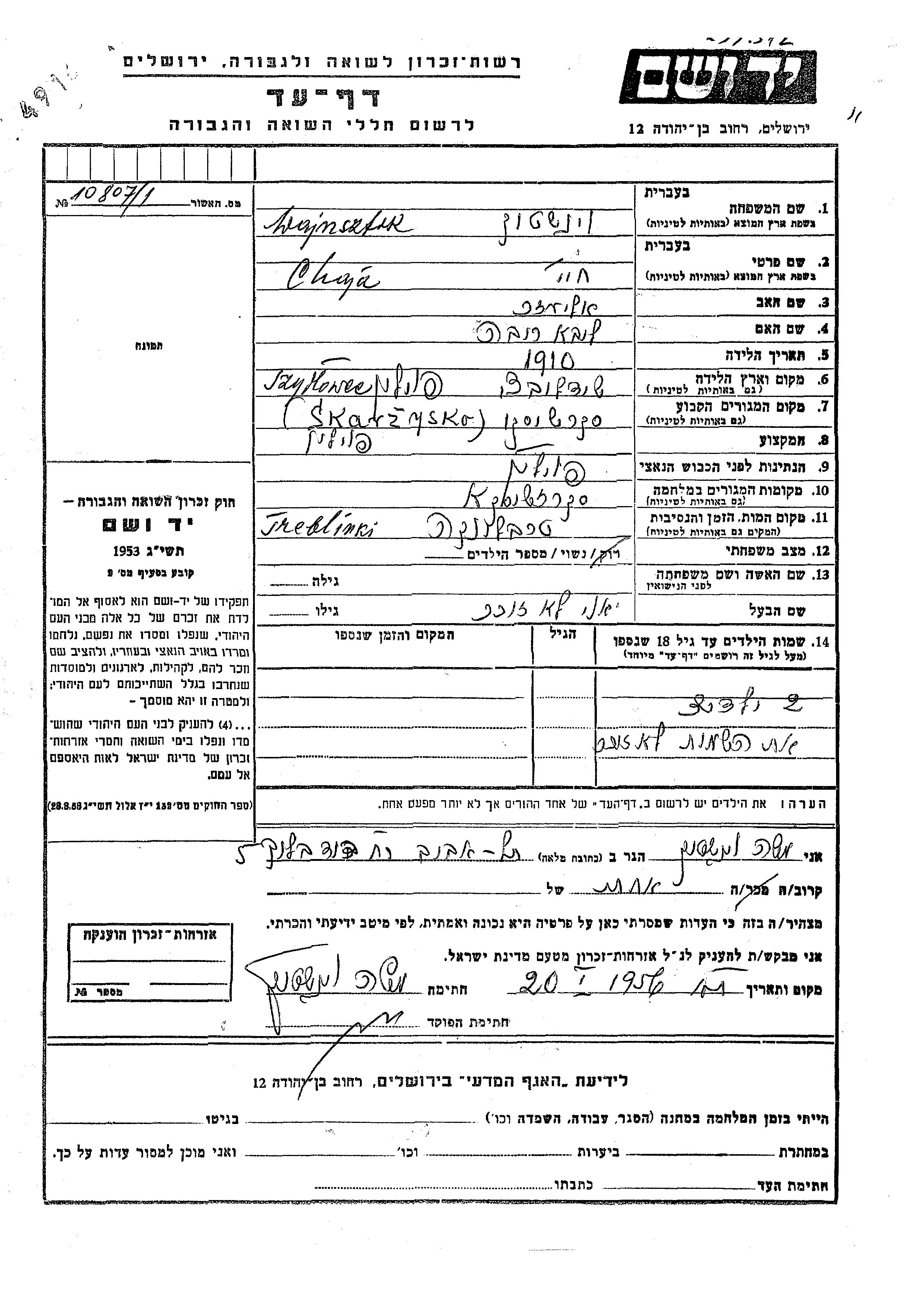 Chaja Wajnsztok was born in Szydlowiec, Poland, 1910 to Eliezer and Liba Riva. She was married. Prior to WWII she lived in Skarzysko Kamienna, Poland. During the war she was in Skarzysko Kamienna, Poland. Chaja was murdered in the Shoah. Place of death: Treblinka, Poland.