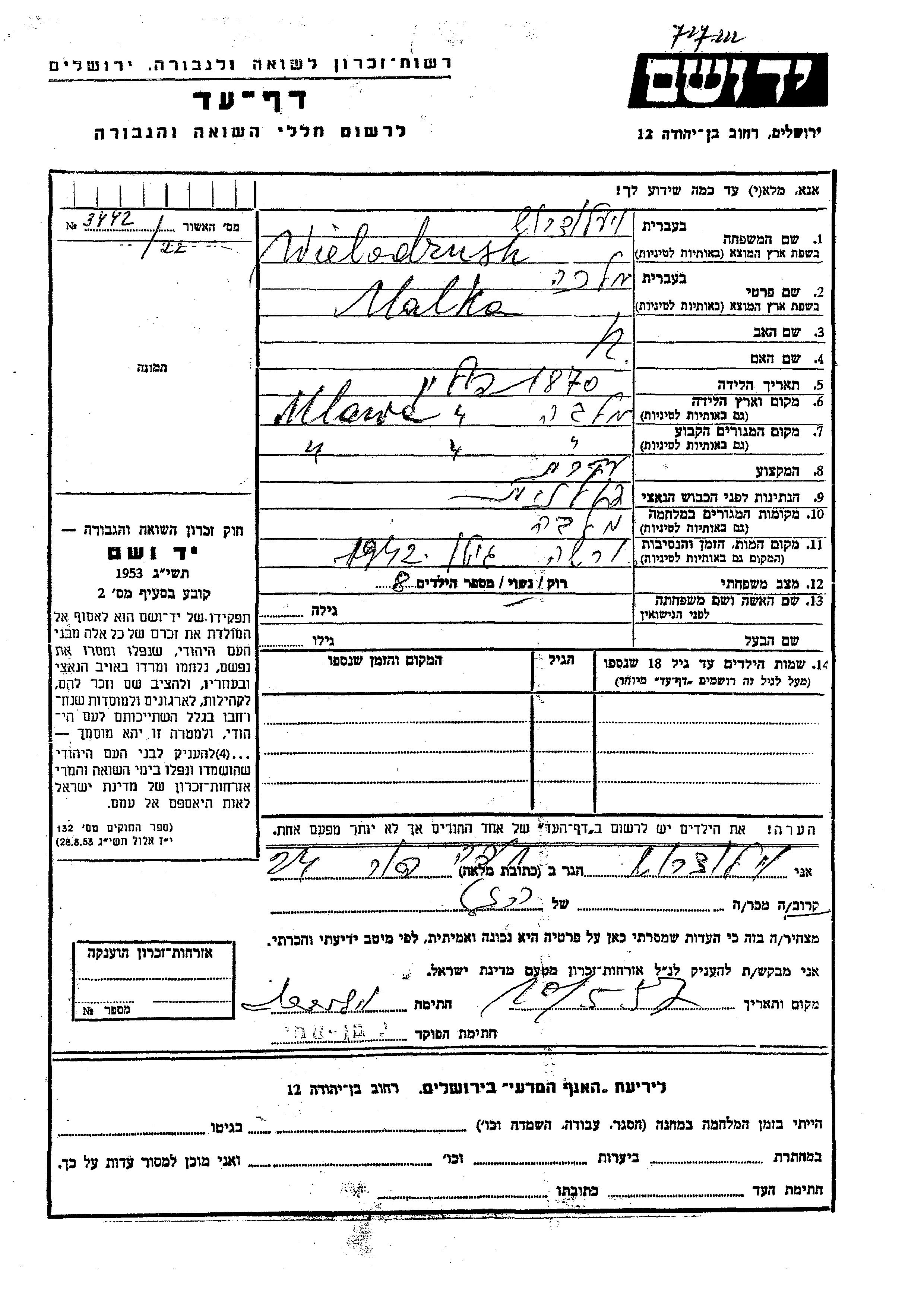 Malka Wielodrush was born in Mlawa, Poland, 1870. She was a housewife and married. Prior to WWII she lived in Mlawa, Poland. During the war she was in Mlawa, Poland. Malka was murdered in the Shoah. Place of death: Warszawa, Poland, 1942.