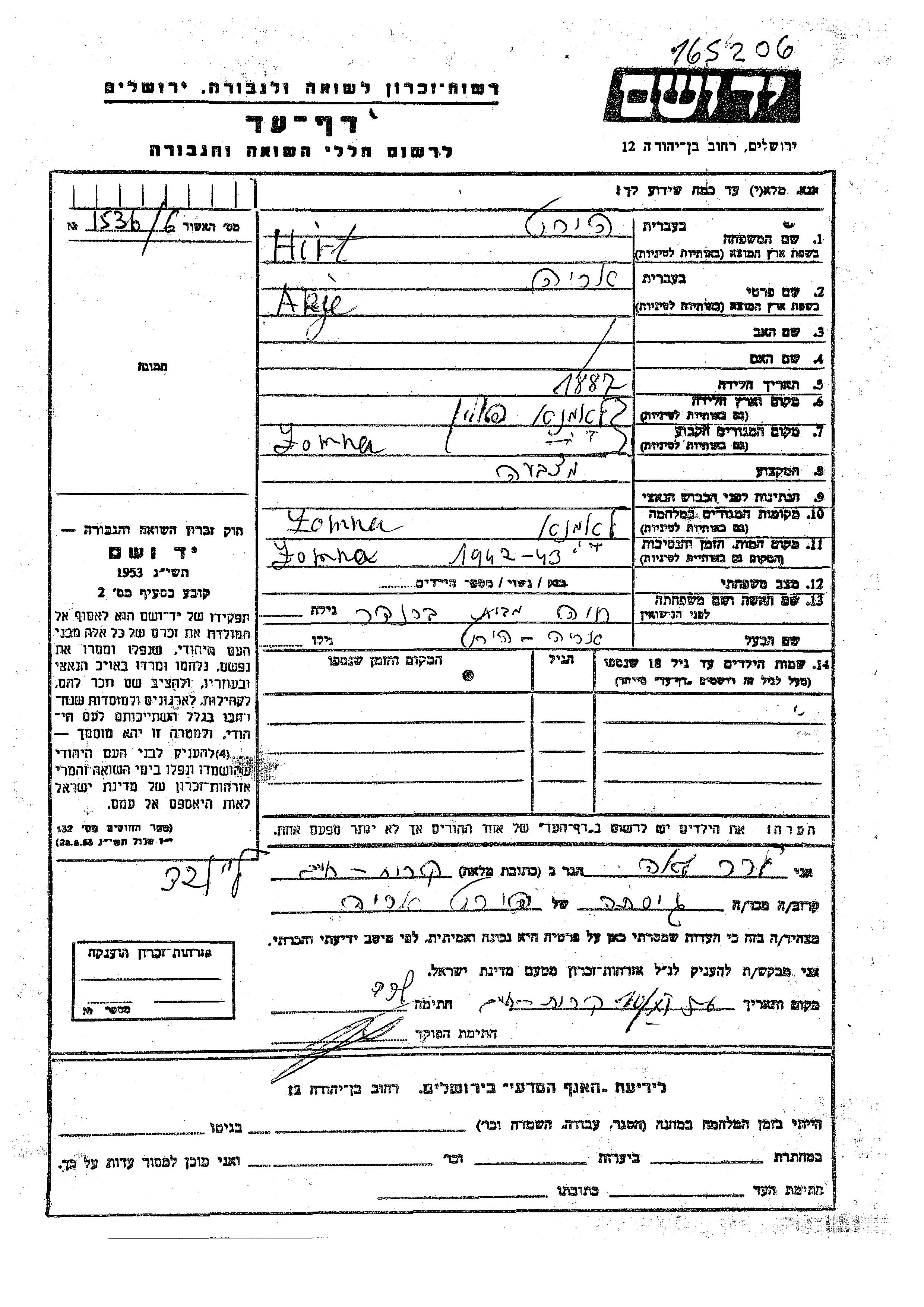 Arje Hirt was born in Lomna, Poland, 1882. He was a painter of houses and married to Arie nee Brander. Prior to WWII he lived in Lomna, Poland. During the war he was in Lomna, Poland. Arje was murdered in the Shoah. Place of death: Lomna, Poland, 1942.
